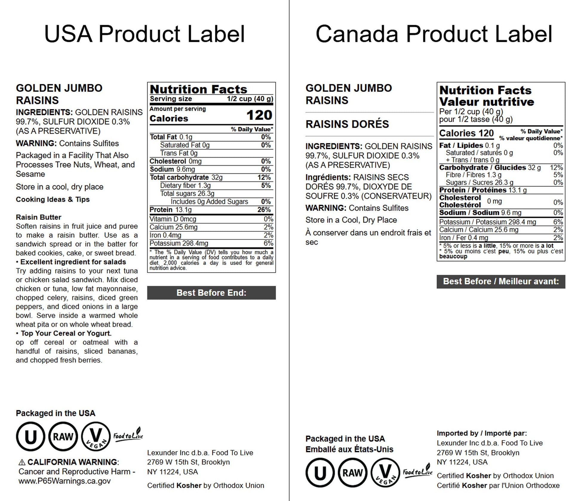 California Jumbo Golden Raisins — Non-GMO Verified, Seedless, Sun-Dried, No Added Oil, No Added Sugar, Kosher, Vegan, Raw, Bulk - by Food to Live