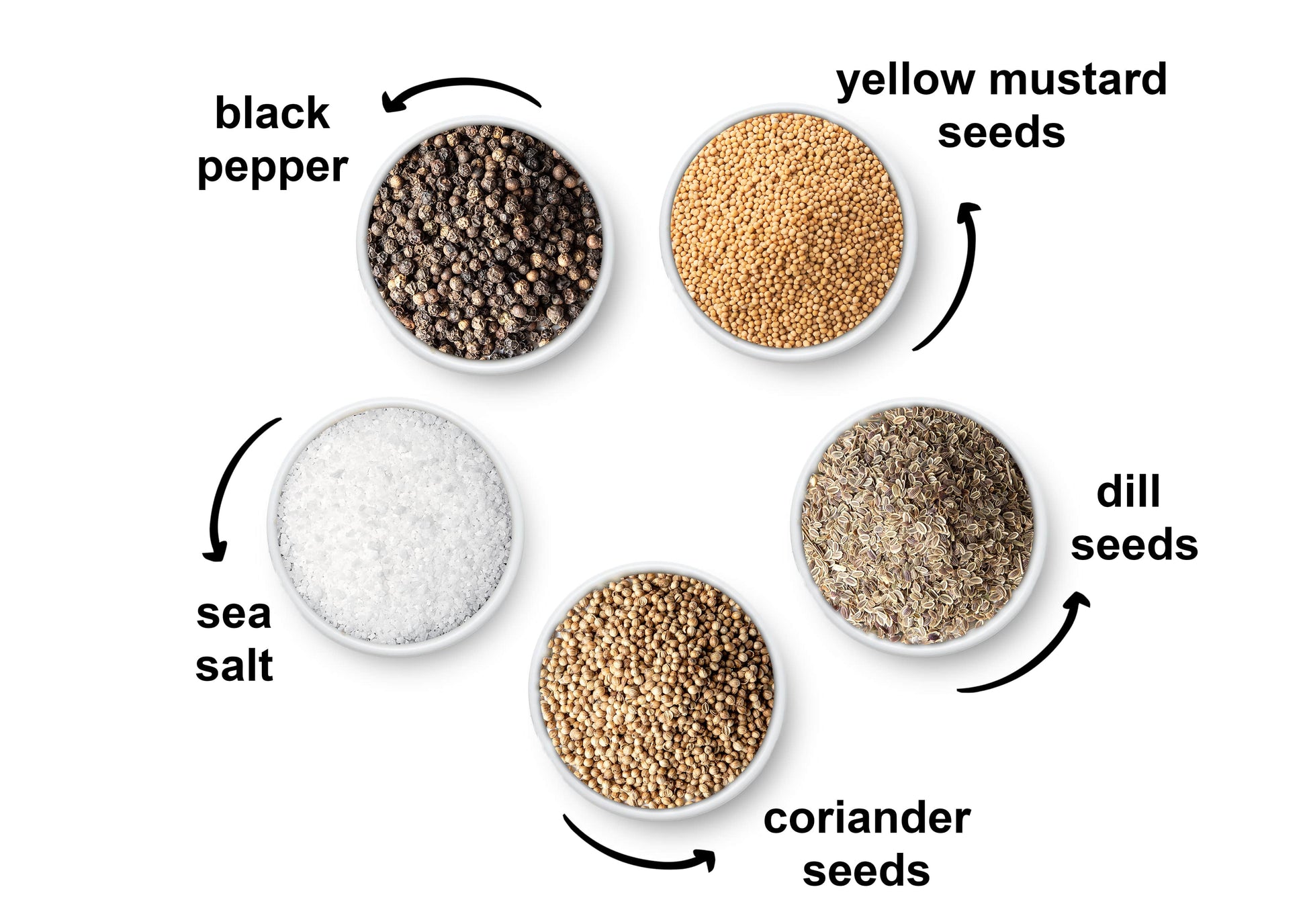 "¢ Fill a mason jar with vertically sliced cucumbers, add, 1 tsp dill pickle seasoning, 1 tsp coriander seeds, 1 tsp yellow mustard seeds, and 2 tsp sea salt.