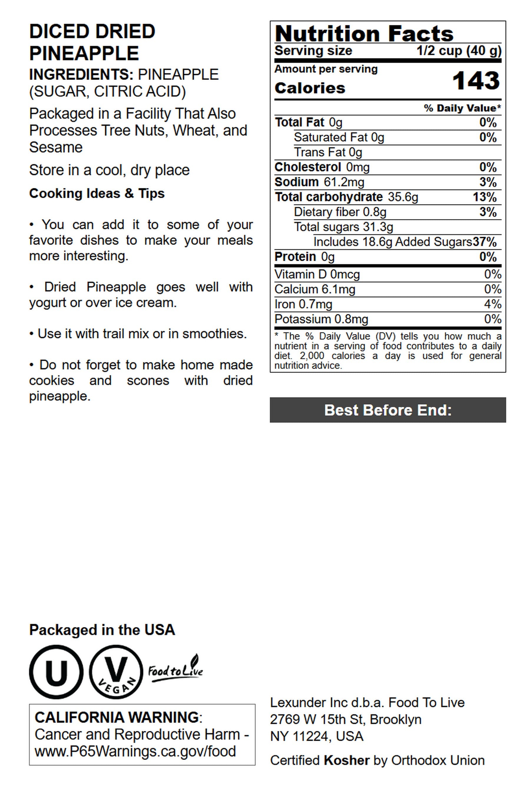 - - CHOLESTEROL FREE and VEGAN: Non-GMO Dried Diced Pineapples Chunks are free of cholesterol and trans-fat and are suitable for a Vegan diet.