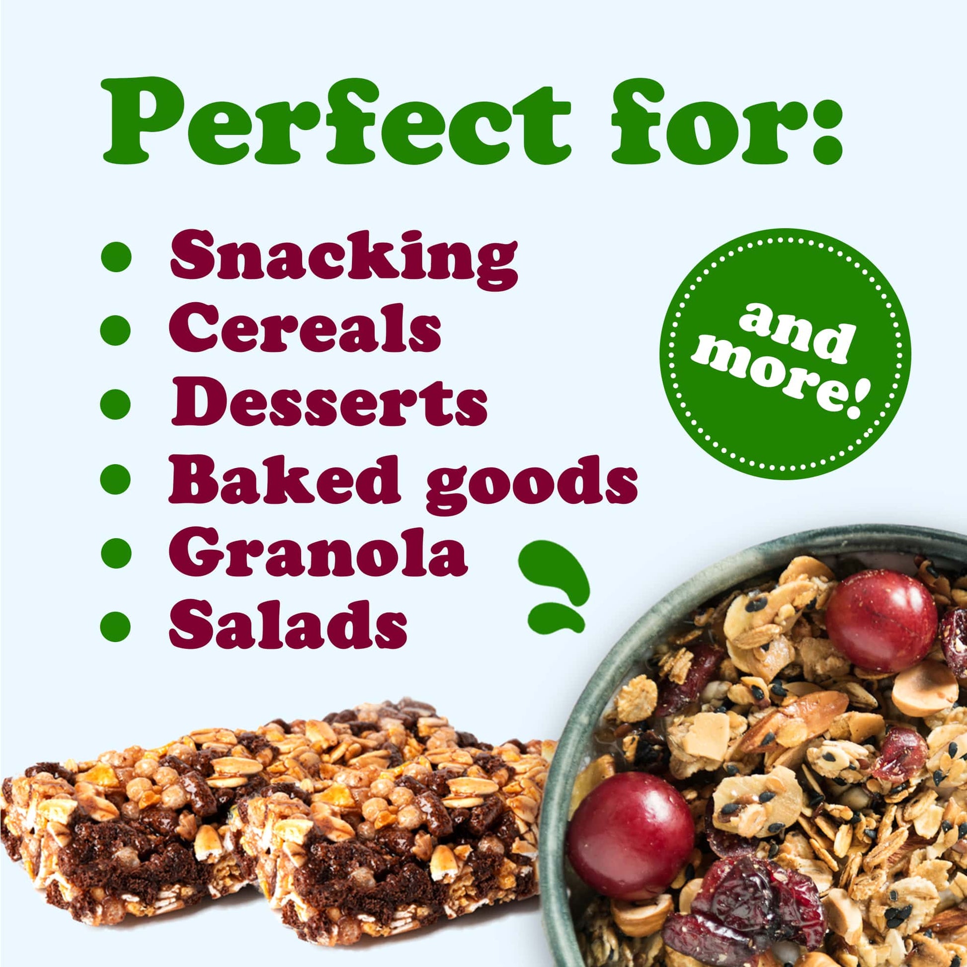 We choose products that can positively impact the body, such as dried fruits, nuts, seeds, grains, powders, flours, spices, and legumes.