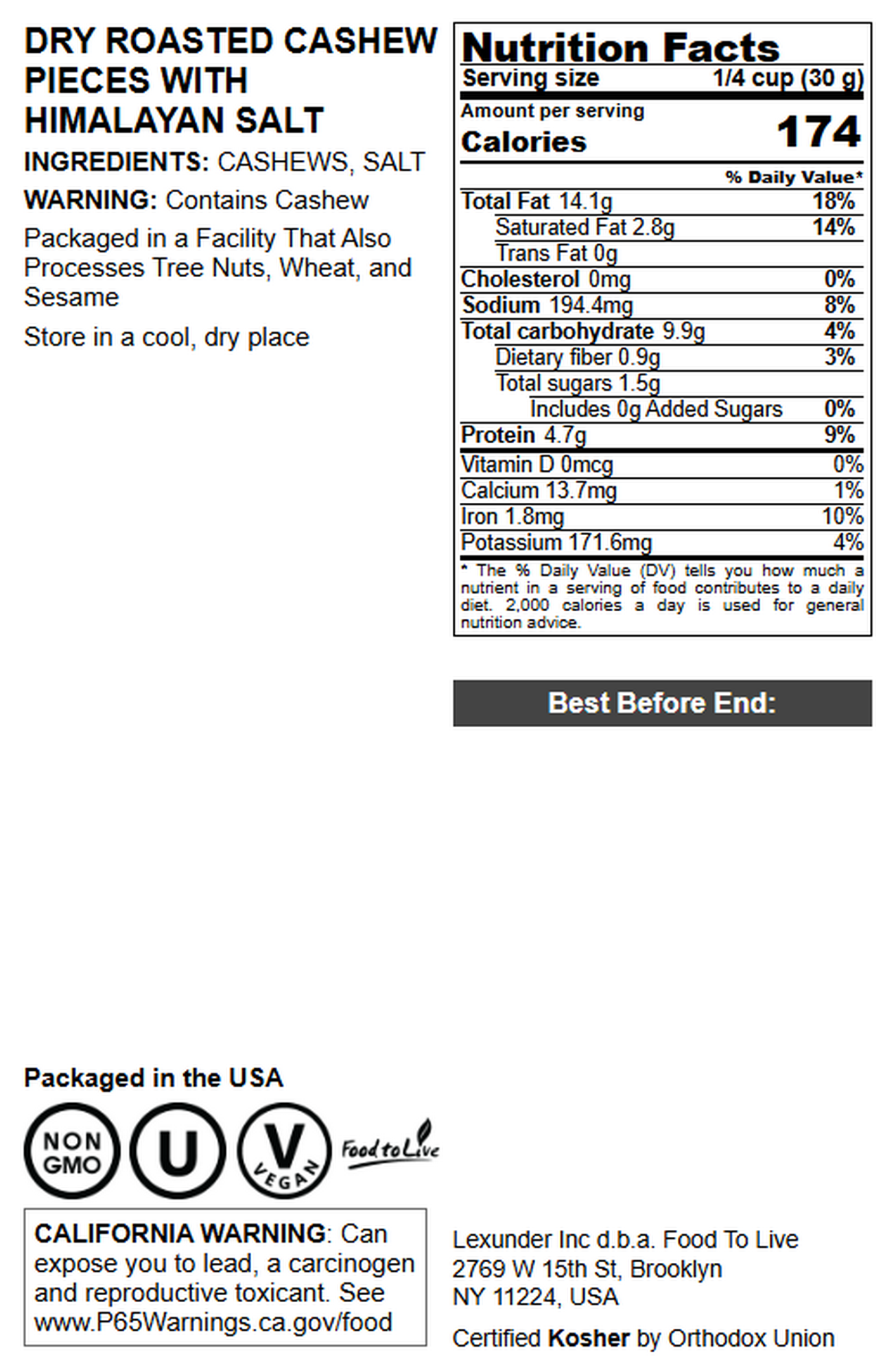 - PREMIUM QUALITY and VEGAN: Food to Live Roasted and Salted Cashew Pieces are of premium quality. They contain no trans-fat, are low in carbs and are suitable for a Vegan meal plan.
