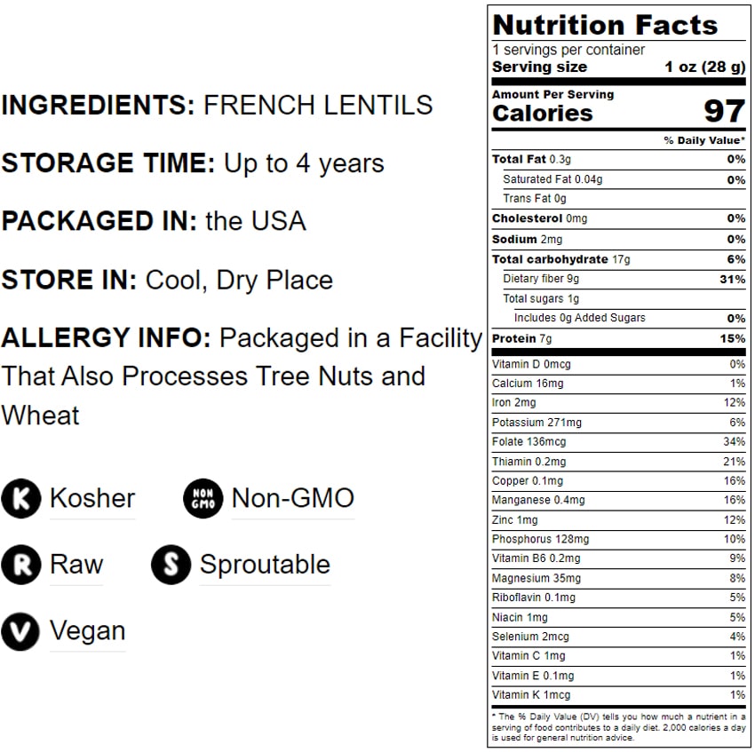 Food to Live French Green Lentils have a deep dark green color, a pleasant and peppery flavor. They're hearty in texture, therefore, hold their shape while cooking. Unlike many other lentils, there's no need to presoak these, which makes them perfect for weeknight salads and pilafs! Cook French Green Lentils in a slow cooker with carrots, extra-virgin olive oil, a bay leaf, and wine for an easy weeknight dinner. Yum!
