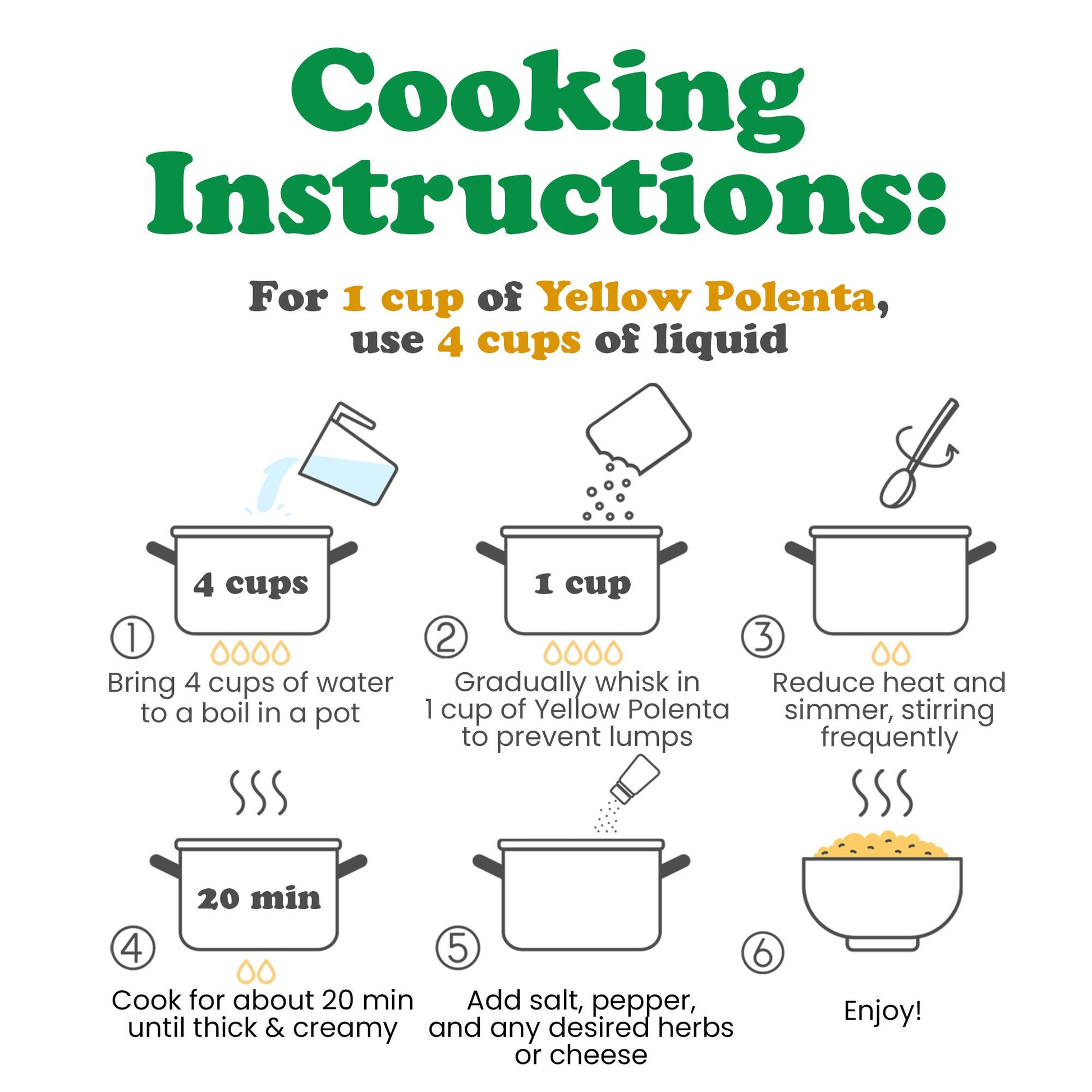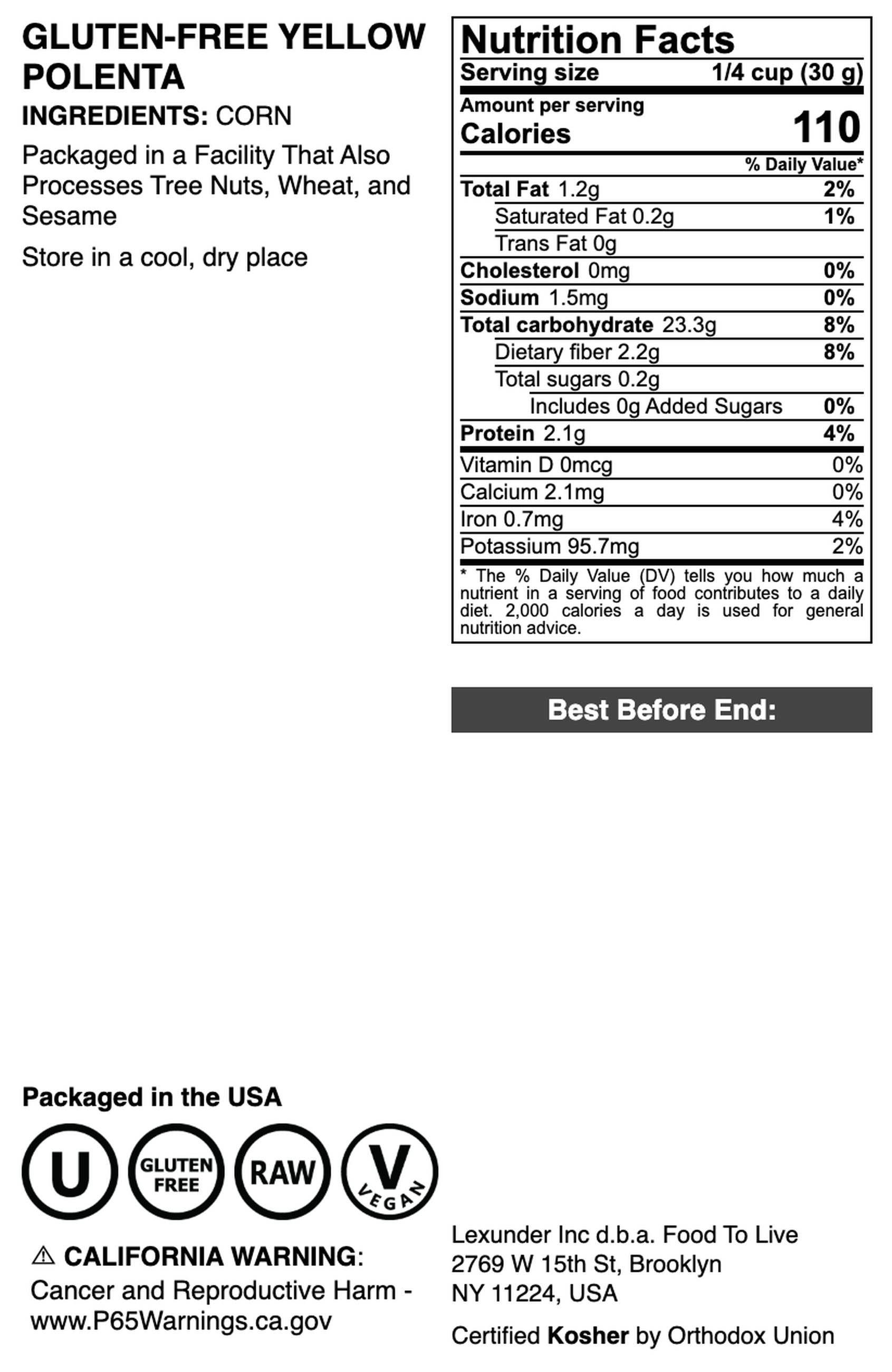 Enjoy Gluten-Free Yellow Polenta in a variety of ways. Serve it as a creamy base for hearty vegetable stews, sautéed mushrooms, or grilled meats. Once cooled, slice it into firm pieces and grill or bake for a crisp, savory side dish. You can also use it as a gluten-free alternative in casseroles, or as a substitute for pasta, rice, or bread. For breakfast, try a sweet version topped with fresh fruit and a drizzle of honey or maple syrup.