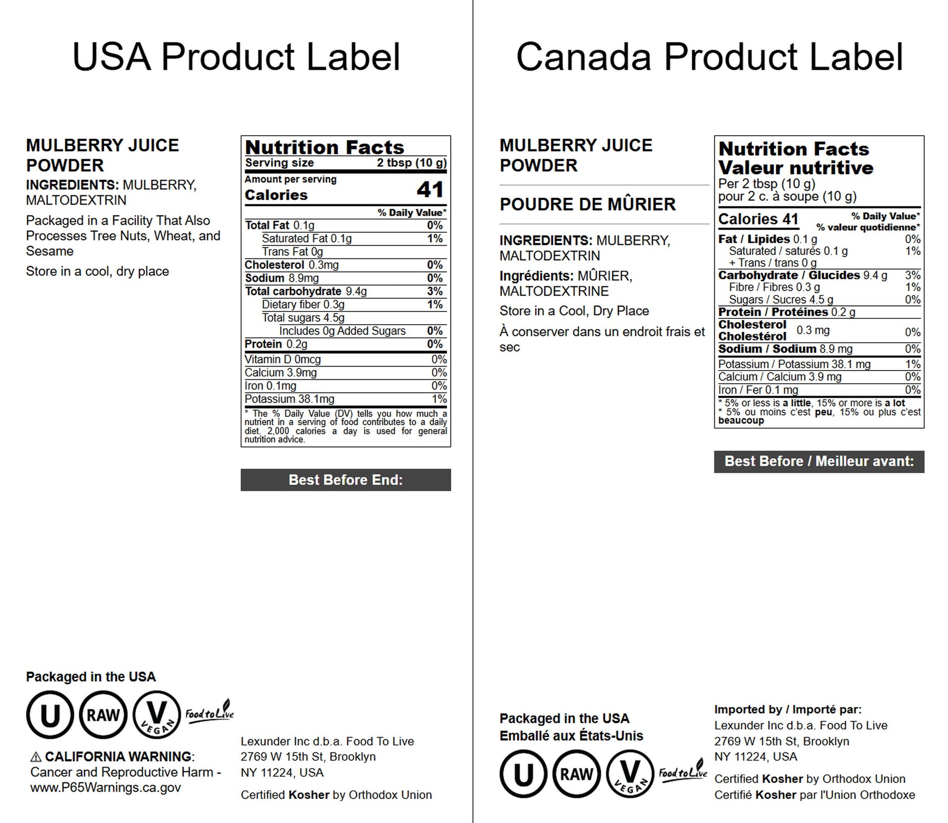 Mulberry Juice Powder - Made from Raw Dried Berries, Unsulfured, Vegan, Bulk, Great for Baking, Juices, Smoothies, Yogurts, and Instant Breakfast Drinks, No Sulphites - by Food to Live