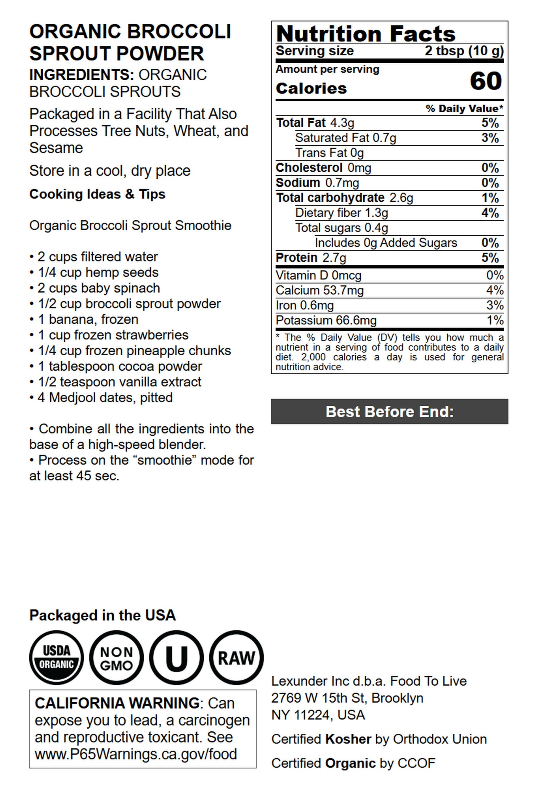 Everyone knows what a broccoli is as well as the fact that it's an exceedingly healthy vegetable. However, there is actually a healthier and more nutritious form of broccoli, which is the sprouts of its seeds. They are like a concentrate of all good things contained in the vegetable and are easier to digest at the same time. The problem is that sprouting broccoli seeds is a complicated process and the tiny greens only last for a couple of days. Therefore, in order to enjoy their benefits regularly, you'll have to set up a non-stop sprouting production, which is time-consuming and requires a bit too much effort. Organic Broccoli Sprout Powder from Food To Live is a simple solution to this problem. This product is made of certified organic sprouted broccoli seeds that are freeze-dried and pulverized using advanced technology. We do our best to ensure that the powder retains as many nutrients as possible, so that you can make your foods healthier by adding it to the recipes.