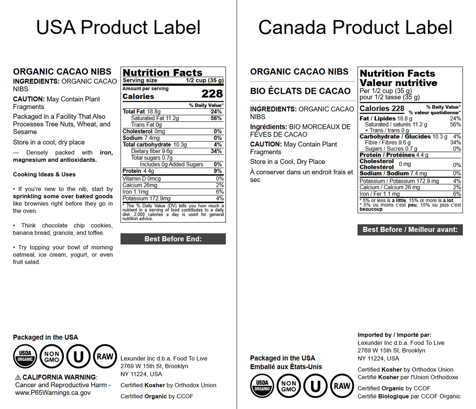 Organic Cacao Nibs - Unsweetened, Non-GMO, Kosher, Raw, Vegan, Sirtfood, Bulk - by Food to Live