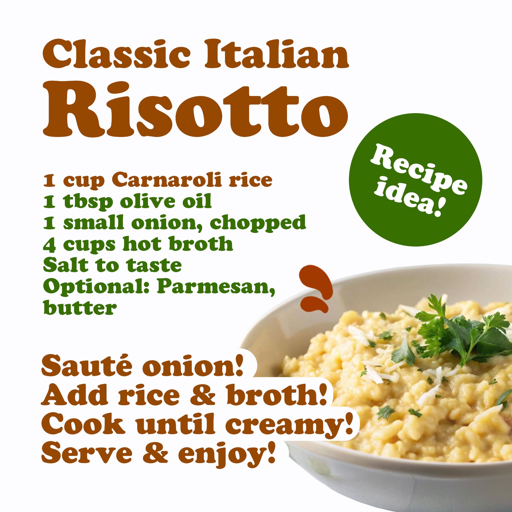 For a classic risotto: In a pan, sauté chopped onions in olive oil. Add 1 cup of Carnaroli rice and toast for 1-2 minutes. Gradually add warm broth, stirring often, until the rice is creamy and tender (about 18-20 minutes). Finish with your choice of vegetables, herbs, or a touch of plant-based butter.