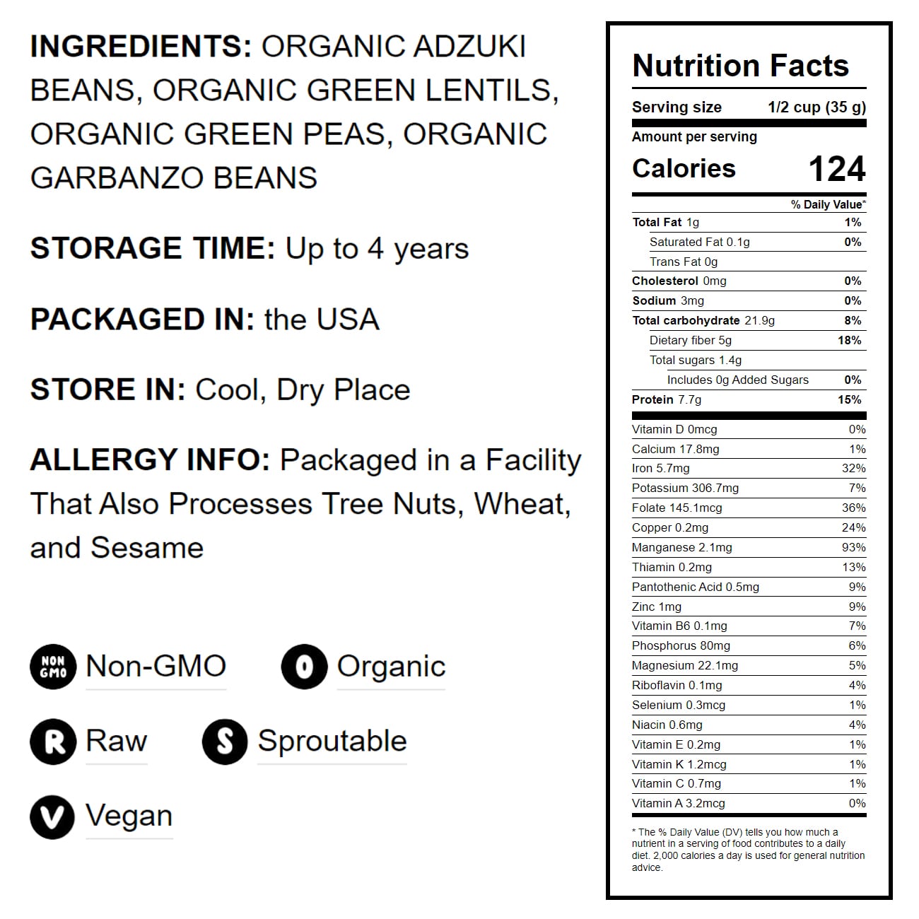 Ingredients: Organic Green Pea, 25%; Organic Adzuki, 25%; Organic Lentil, 25%; Organic Garbanzo, 25%. This flavorful blend of organic beans is great as a fresh snack, in salads, soups, and it can be mixed into a variety of other meals to give them a healthy crunch. The organic beans are ideal for people who are on weight-loss diet, since they are low in fat and high in protein. The high-protein content makes you feel full for long and the low-fat content helps in limiting calorie intake. Nutritional Information: Being high in protein, Crunchy Organic Sprouts contain all the essential amino acids. They are also high in iron, calcium, phosphorous, potassium, vitamins A, C, E, niacin and folate.