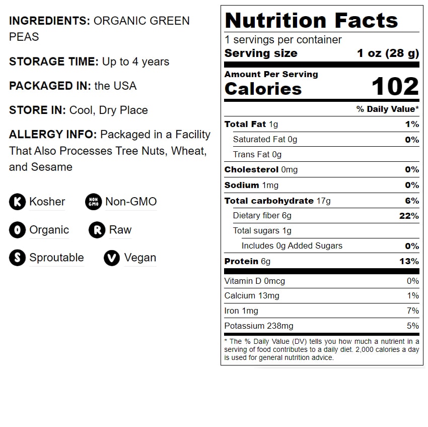 When adding organic dried green peas to your meal plan, remember they give you a sizeable serving of fiber and plant-based proteins, what's there not to like. Also, naturally rich in B vitamins, this plant is a legume by definition; you can count it towards your daily serving of vegetables.