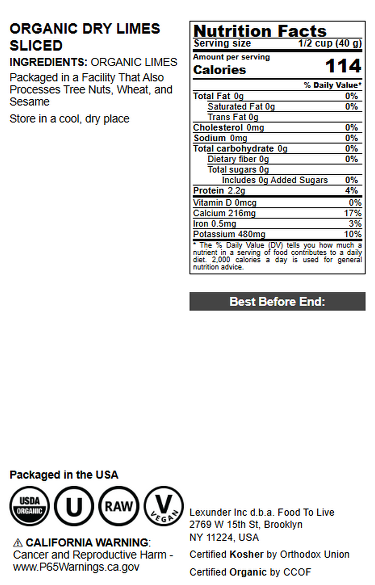 Experience the bright, concentrated flavor of citrus with our Organic Dry Limes Sliced. We select high-quality, fresh organic limes and slice them thin, preserving the entire fruit-rind, pith, and pulp. They are then carefully dehydrated at low temperatures to lock in their wonderfully tangy aroma and potent taste. Unlike fresh limes, these dried slices offer a deeper, slightly earthy, and intensely sour profile, making them a unique and versatile ingredient. Their beautiful, rustic appearance makes them perfect for both culinary use and decoration.