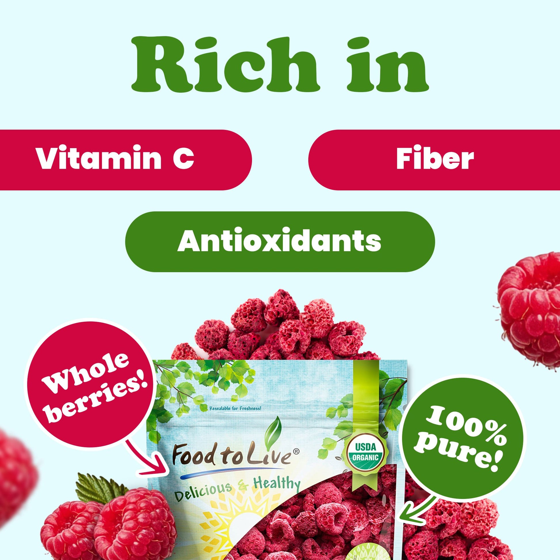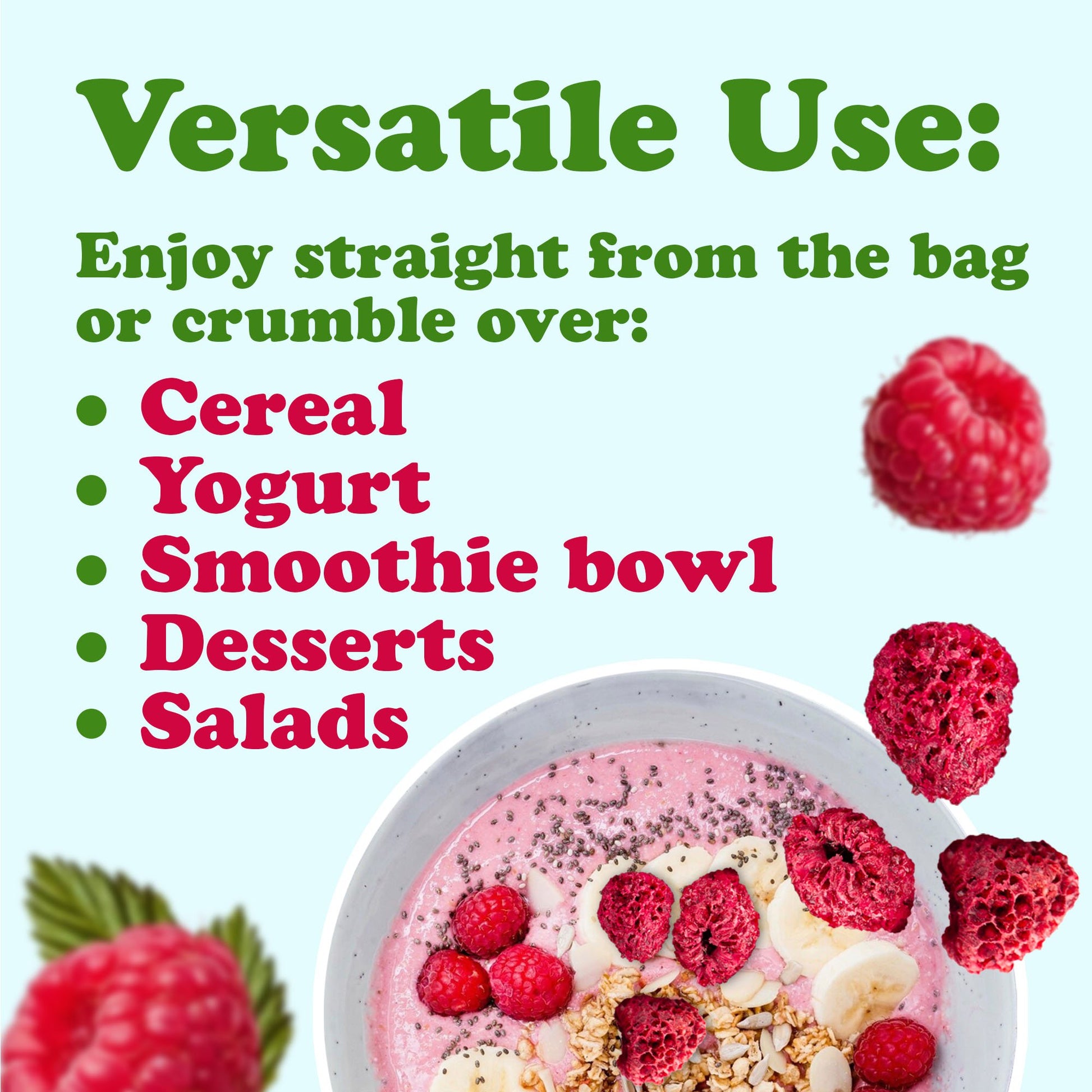 Organic Freeze-Dried Raspberries are incredibly versatile. Enjoy them as a crunchy snack straight from the bag, or add them to cereals, oatmeal, granola, and trail mixes for a pop of color and taste. They blend easily into smoothies and can be used to top yogurt, chia pudding, or desserts. Crushed, they make a vibrant powder for flavoring frostings or homemade energy bars.