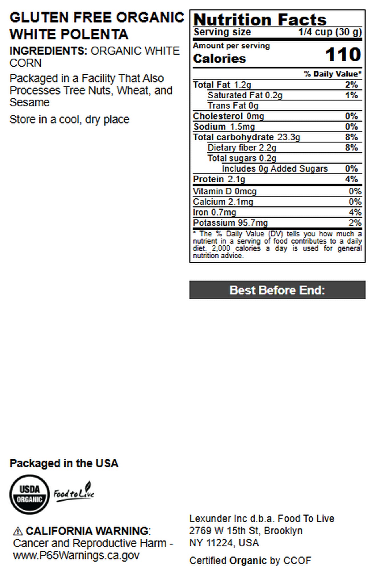 ✔️LONG SHELF LIFE: With proper storage, this Gluten Free Organic White Polenta from Food to Live can last up to 1.5 years.