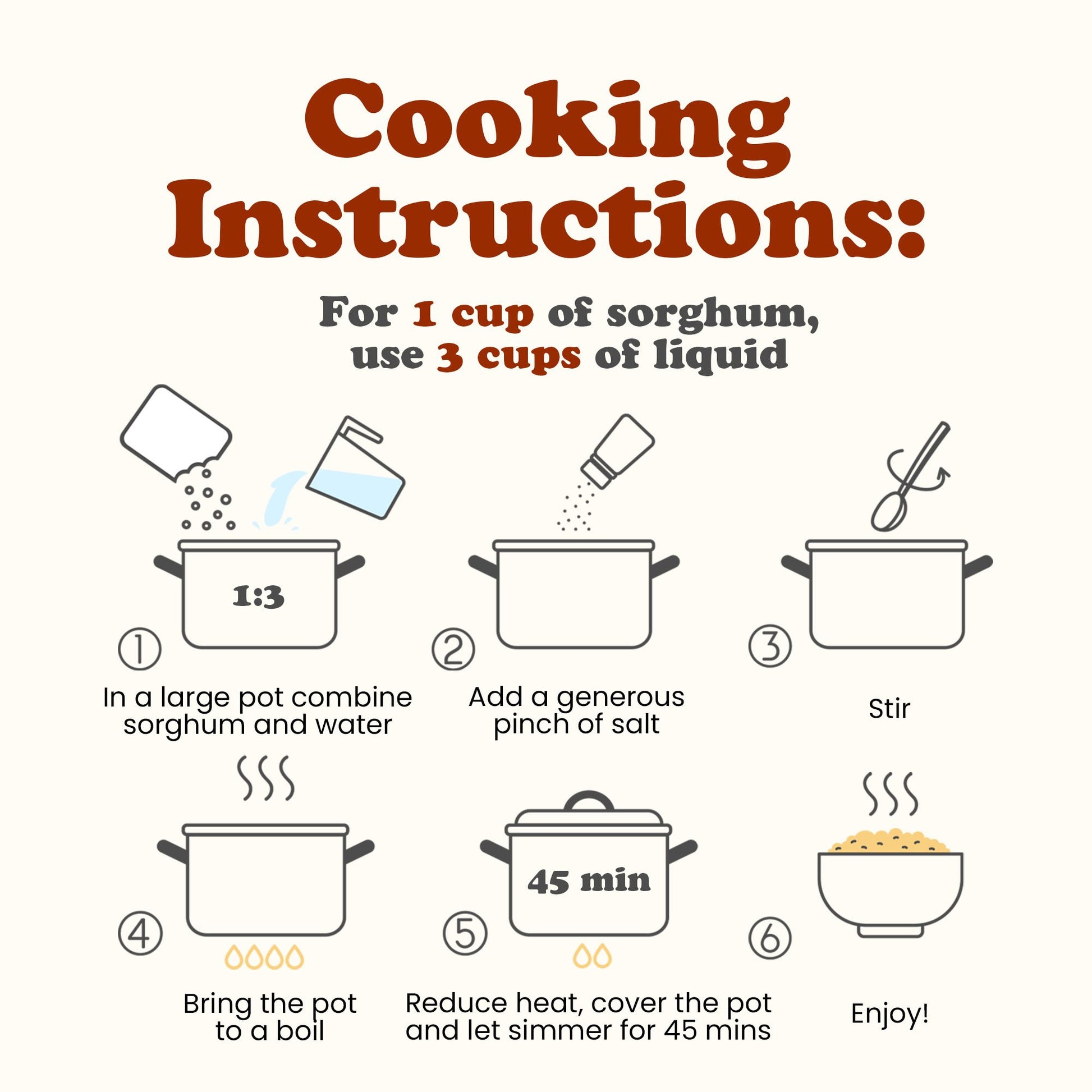 Rinse 1 cup of sorghum thoroughly. In a pot, combine with 3 cups of water. Bring to a boil, then reduce heat and simmer for 50-60 minutes or until tender. Drain any excess water and fluff with a fork before serving.