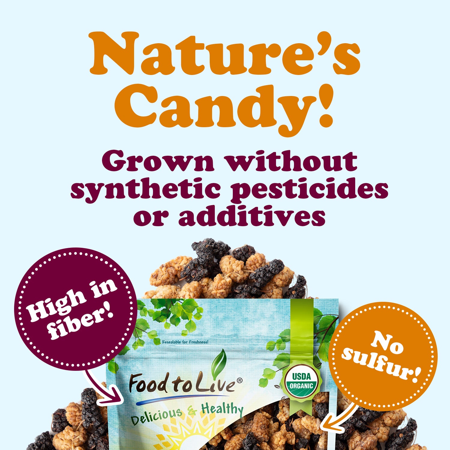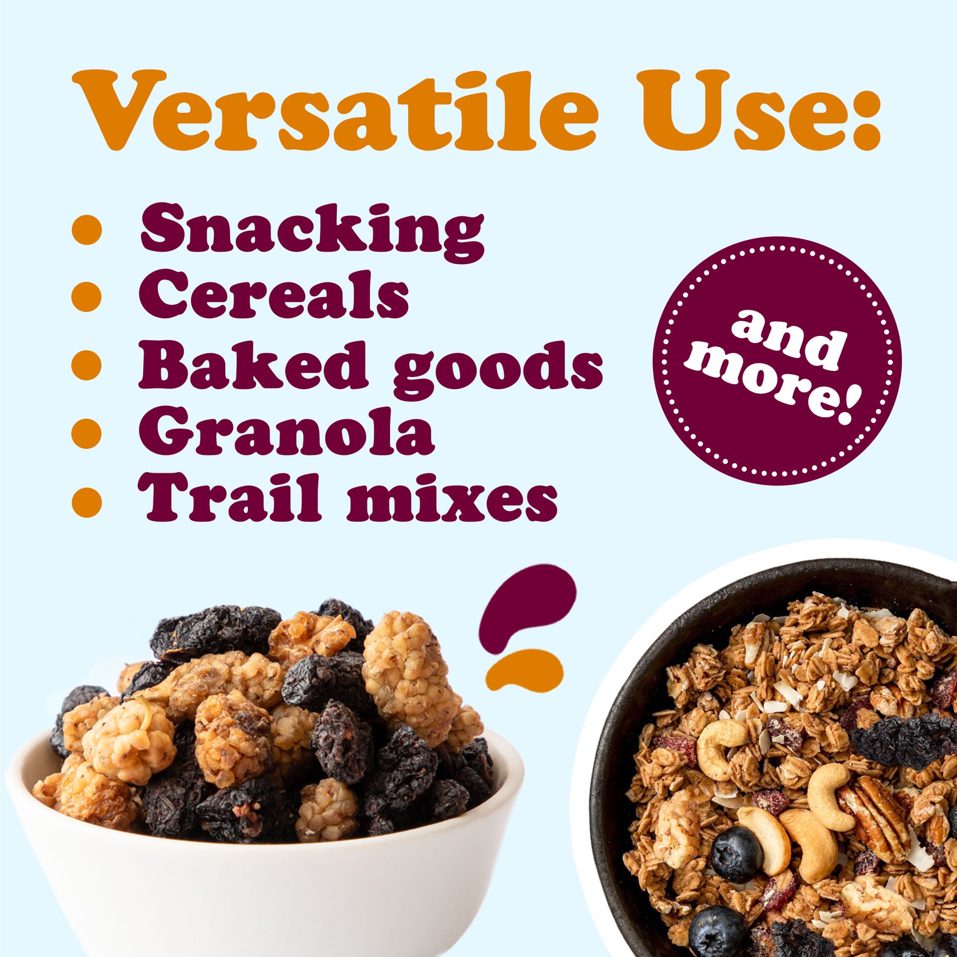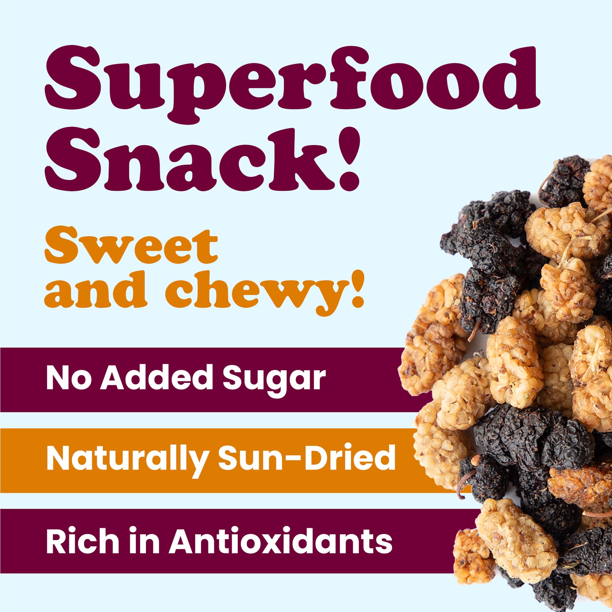 Enjoy our Organic Mulberry Mix straight from the bag as a wholesome snack or use it to enhance a variety of recipes. Sprinkle over oatmeal, mix into granola, or bake into muffins and cookies. Add to salads for a chewy texture, or blend into smoothies for a fruity twist. They also pair beautifully with yogurt, trail mixes, and nut butters.