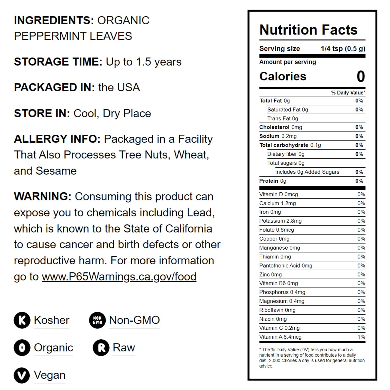 - ORGANIC PEPPERMINT LEAVES: Dried, cut and sifted to ensure quality and freshness. Non-GMO and caffeine-free.