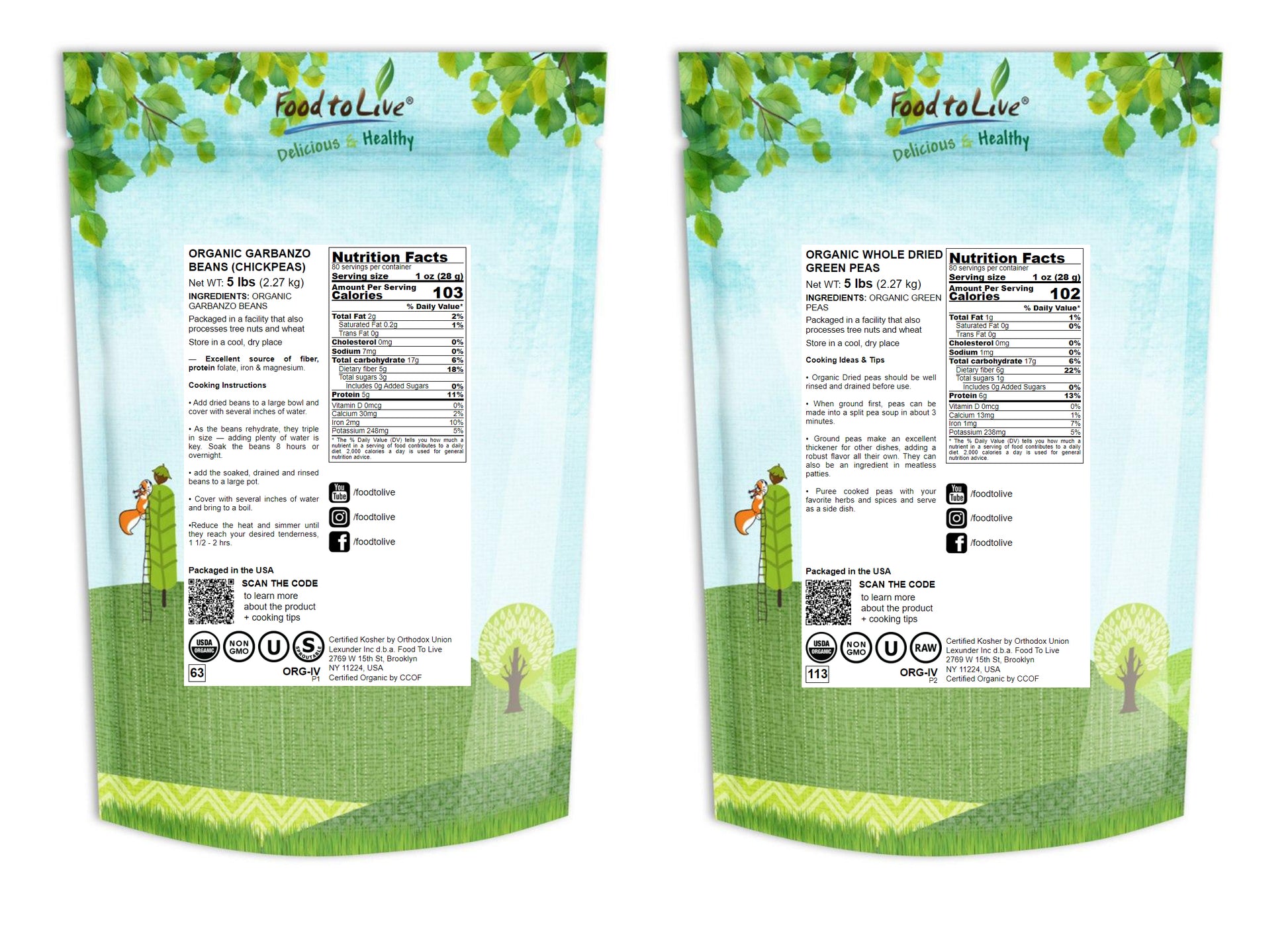 Organic Pulses Bundle, 2 Pack - Organic Chickpeas (5 LB), Organic Whole Green Peas (5 LB) - by Food To Live