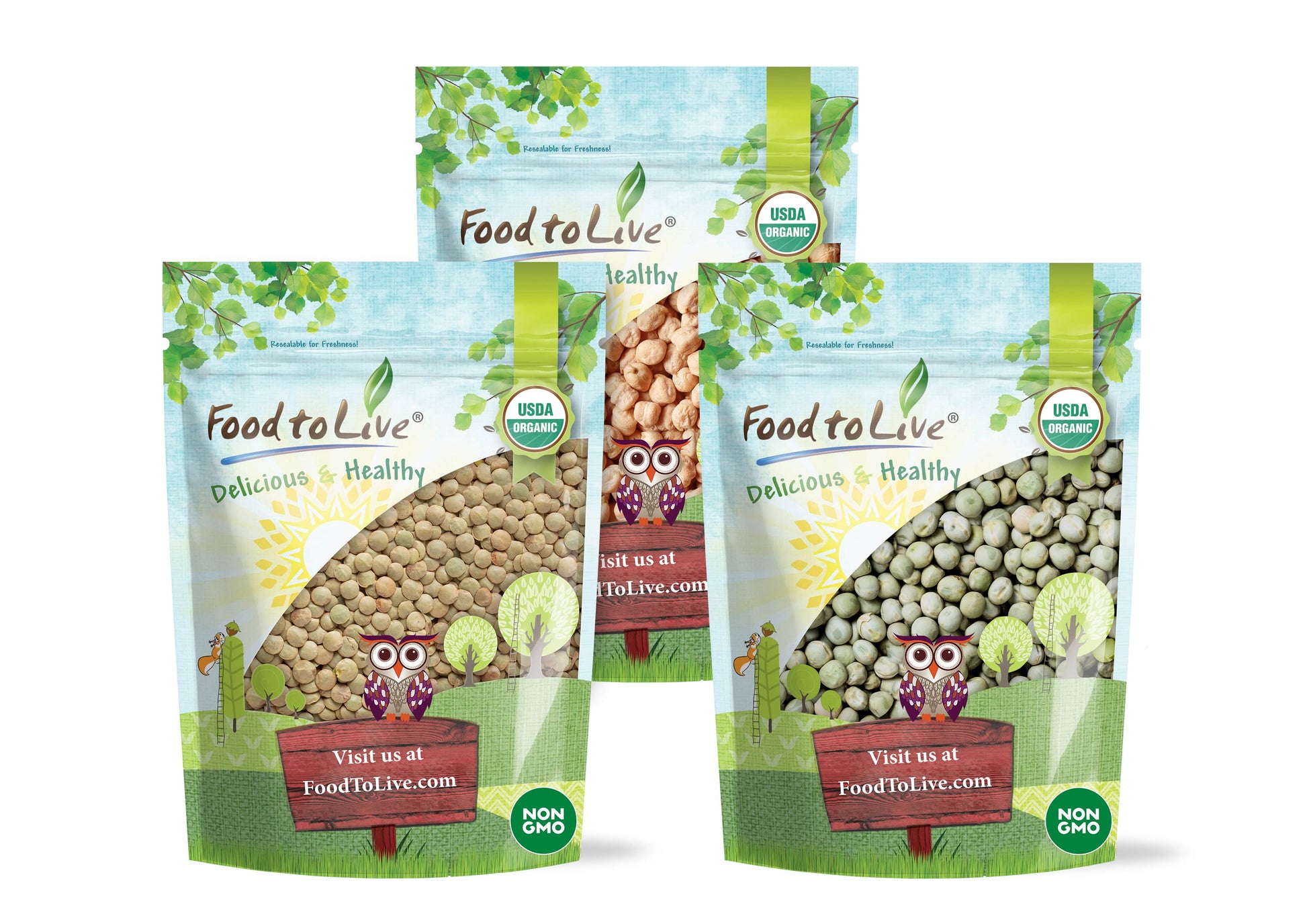 Organic Pulses Bundle, 3 Pack - Organic Whole Green Peas (5 LB), Organic Green Lentils (5 LB), Organic Chickpeas (5 LB) - by Food To Live