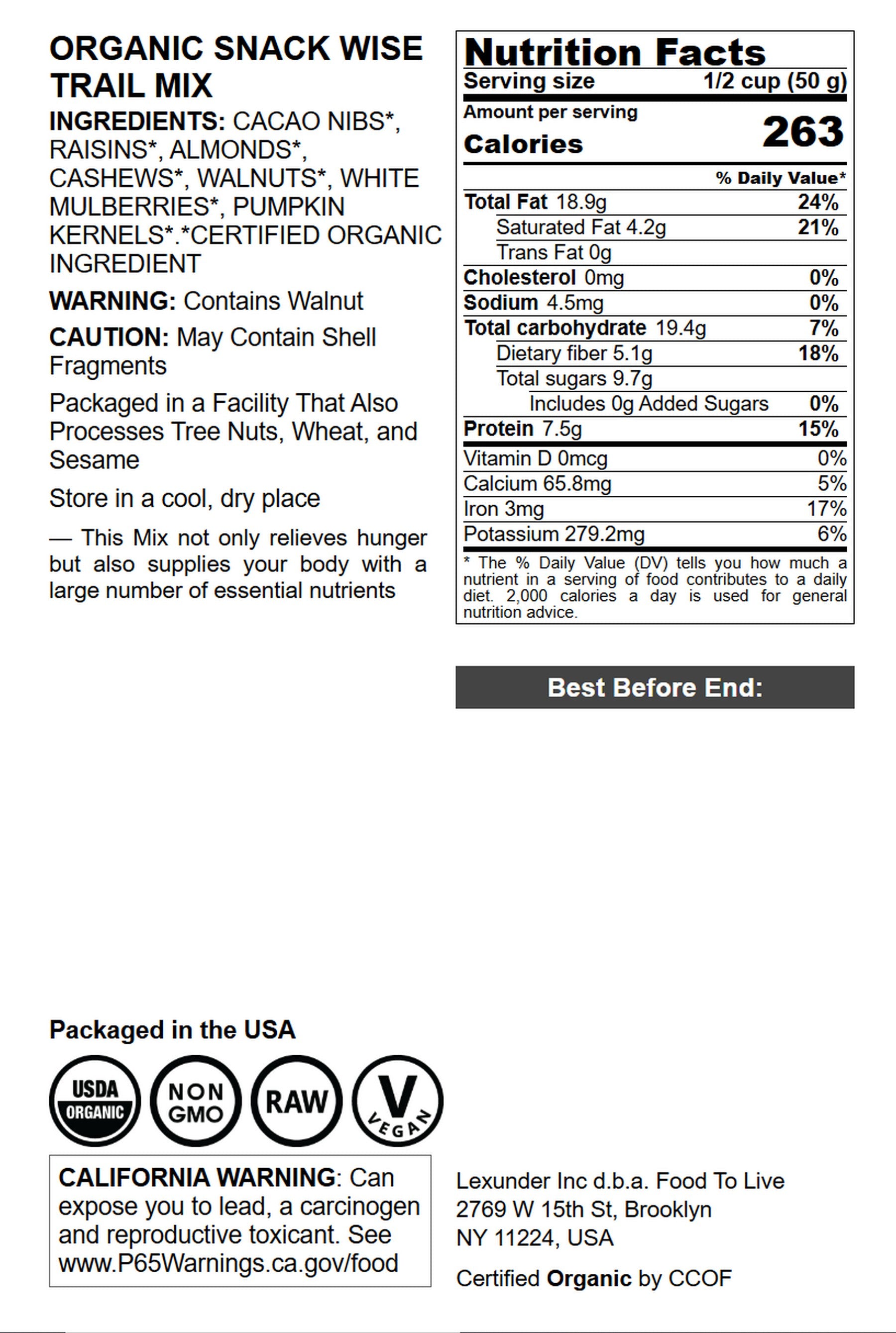 Organic Snack Wise Trail Mix with selective dried fruits and nuts will be a regular in your home. This mix consists of Organic Cacao Nibs, Organic Raisins, Organic Almonds, Organic Cashews, Organic Walnuts, Organic Dried White Mulberries, and Organic Pumpkin Kernels.
