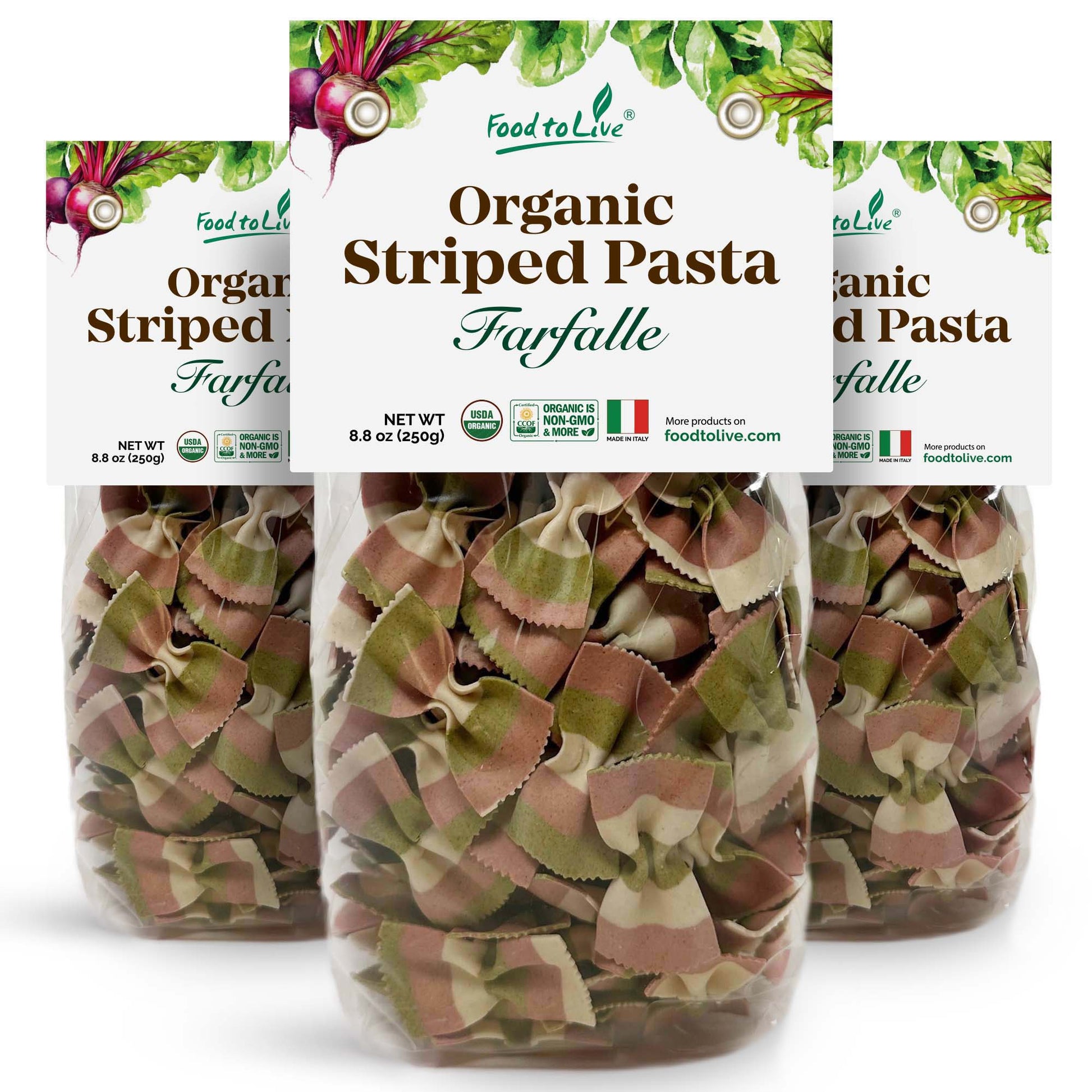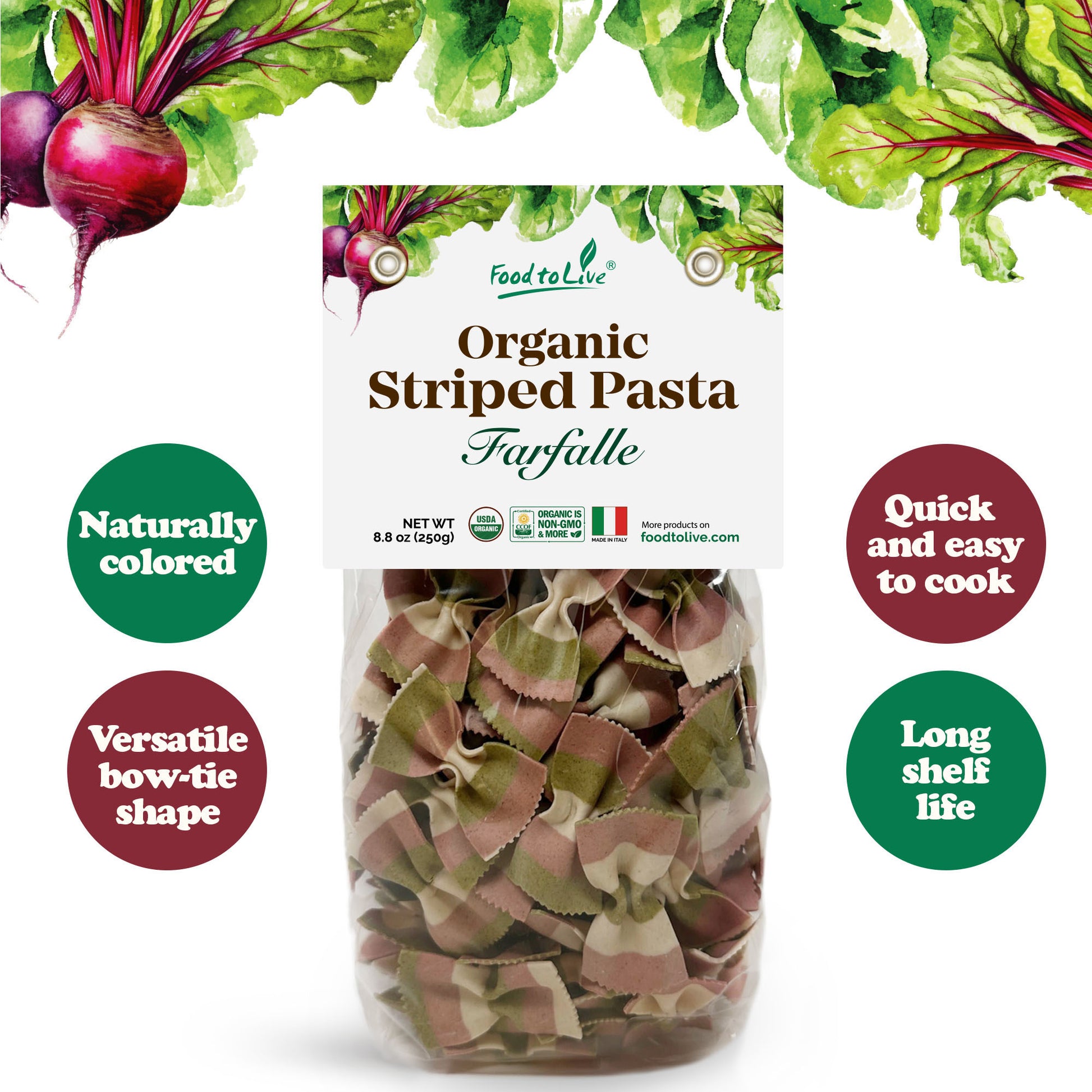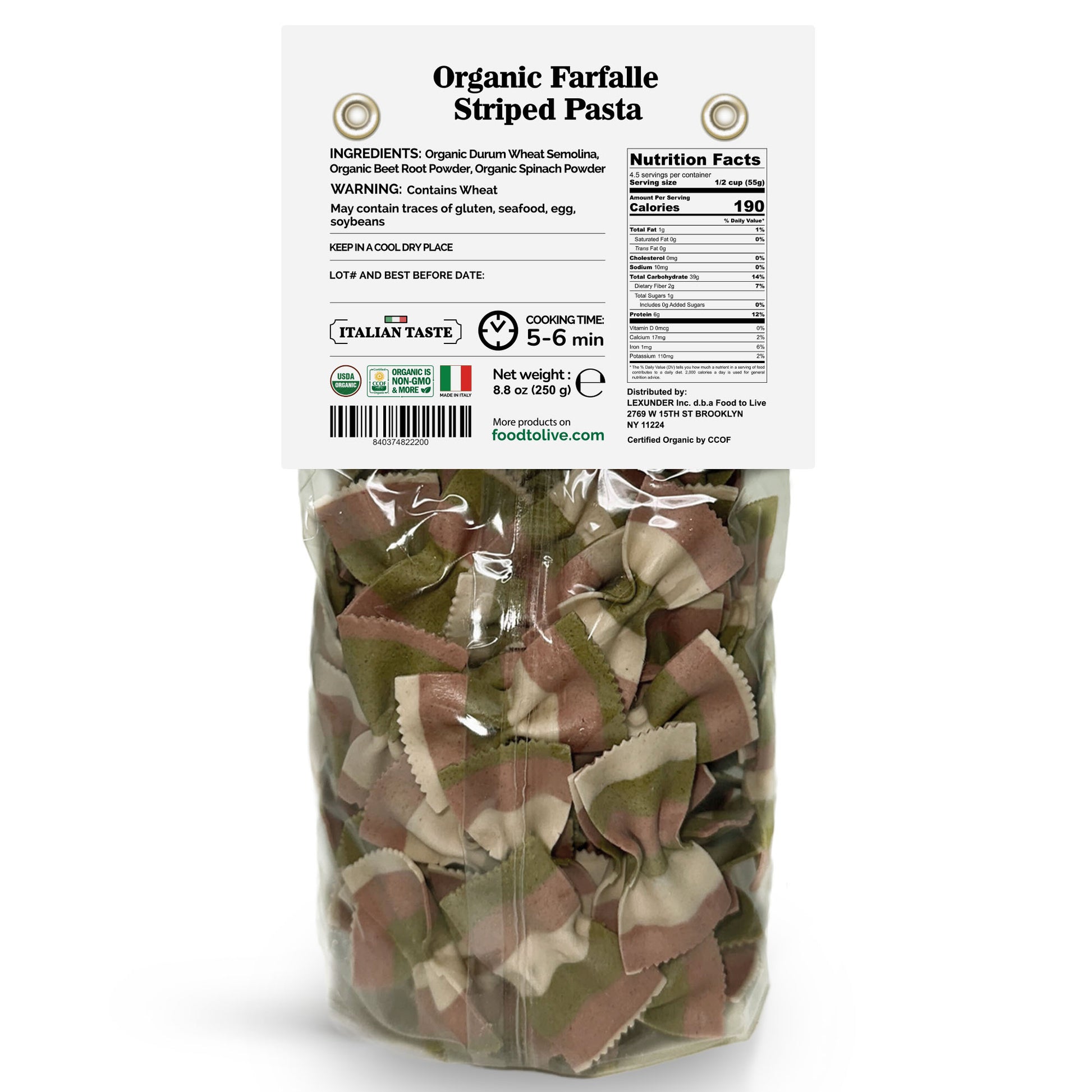 Elevate your cooking with Organic Striped Farfalle Pasta from Food to Live, a stunning tri-color bow-tie pasta crafted in Italy with the finest organic ingredients. Made with Organic Durum Wheat Semolina, Organic Beet Root Powder, and Organic Spinach Powder, this pasta achieves its vibrant appearance naturally, without artificial additives. Perfect for gourmet dishes and everyday meals, it adds both beauty and flavor to your creations. Its Non-GMO and vegan composition makes it suitable for a wide range of dietary preferences.