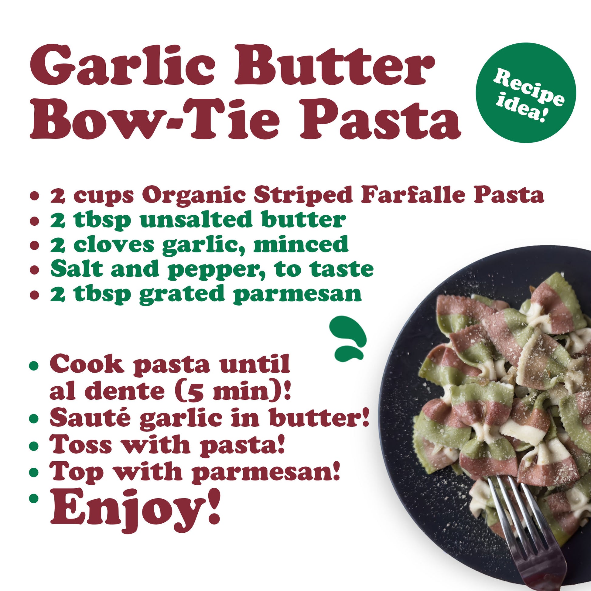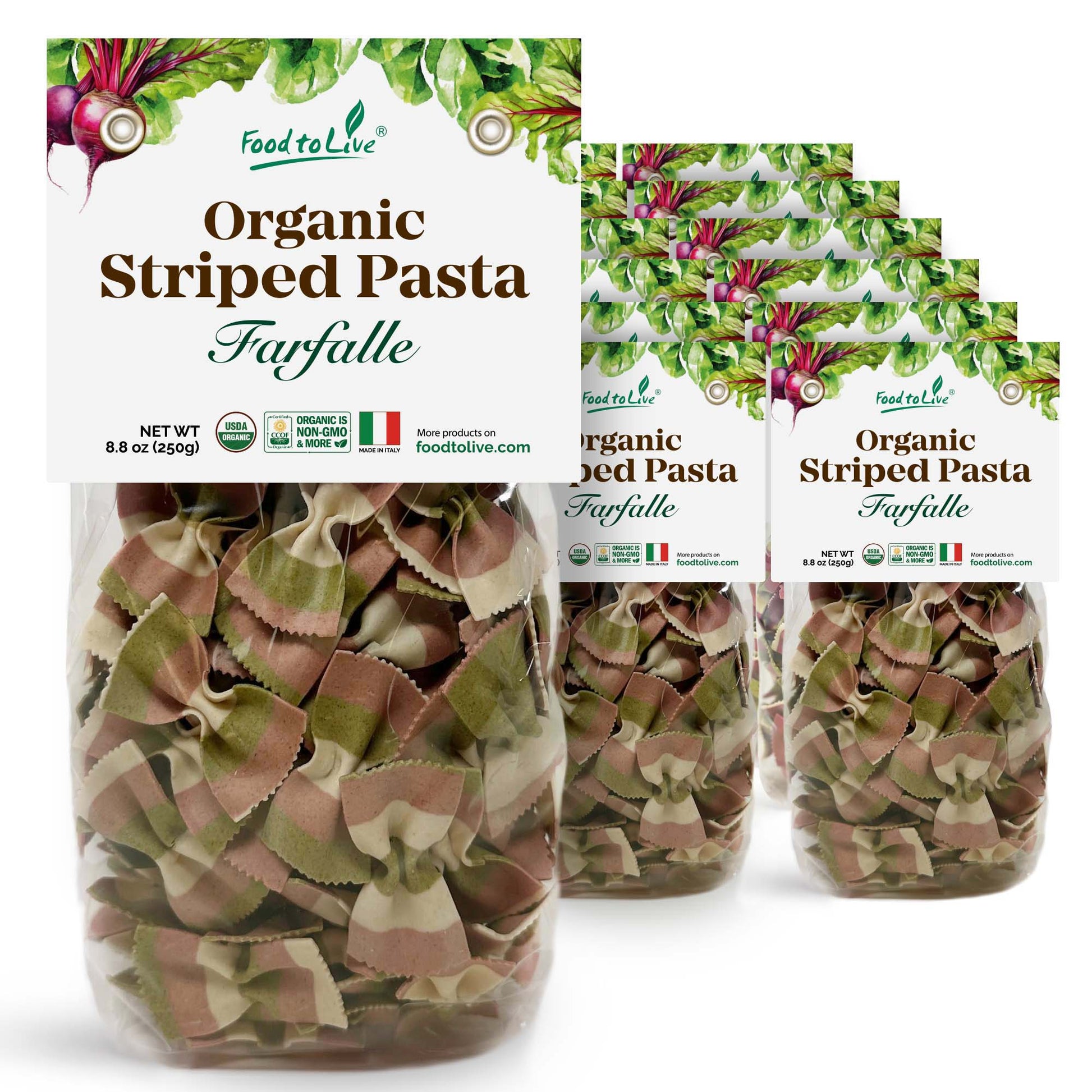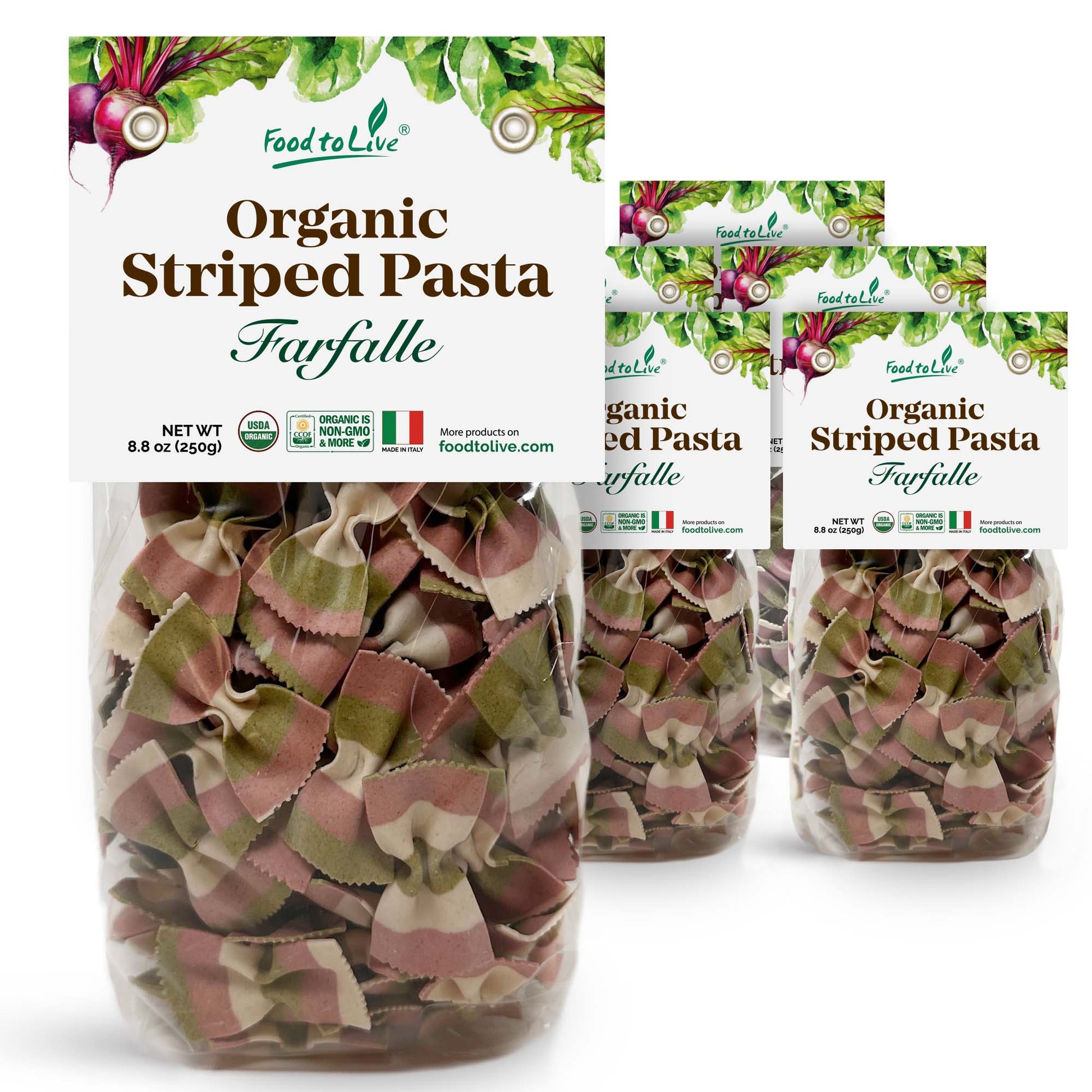 Elevate your cooking with Organic Striped Farfalle Pasta from Food to Live, a stunning tri-color bow-tie pasta crafted in Italy with the finest organic ingredients. Made with Organic Durum Wheat Semolina, Organic Beet Root Powder, and Organic Spinach Powder, this pasta achieves its vibrant appearance naturally, without artificial additives. Perfect for gourmet dishes and everyday meals, it adds both beauty and flavor to your creations. Its Non-GMO and vegan composition makes it suitable for a wide range of dietary preferences.