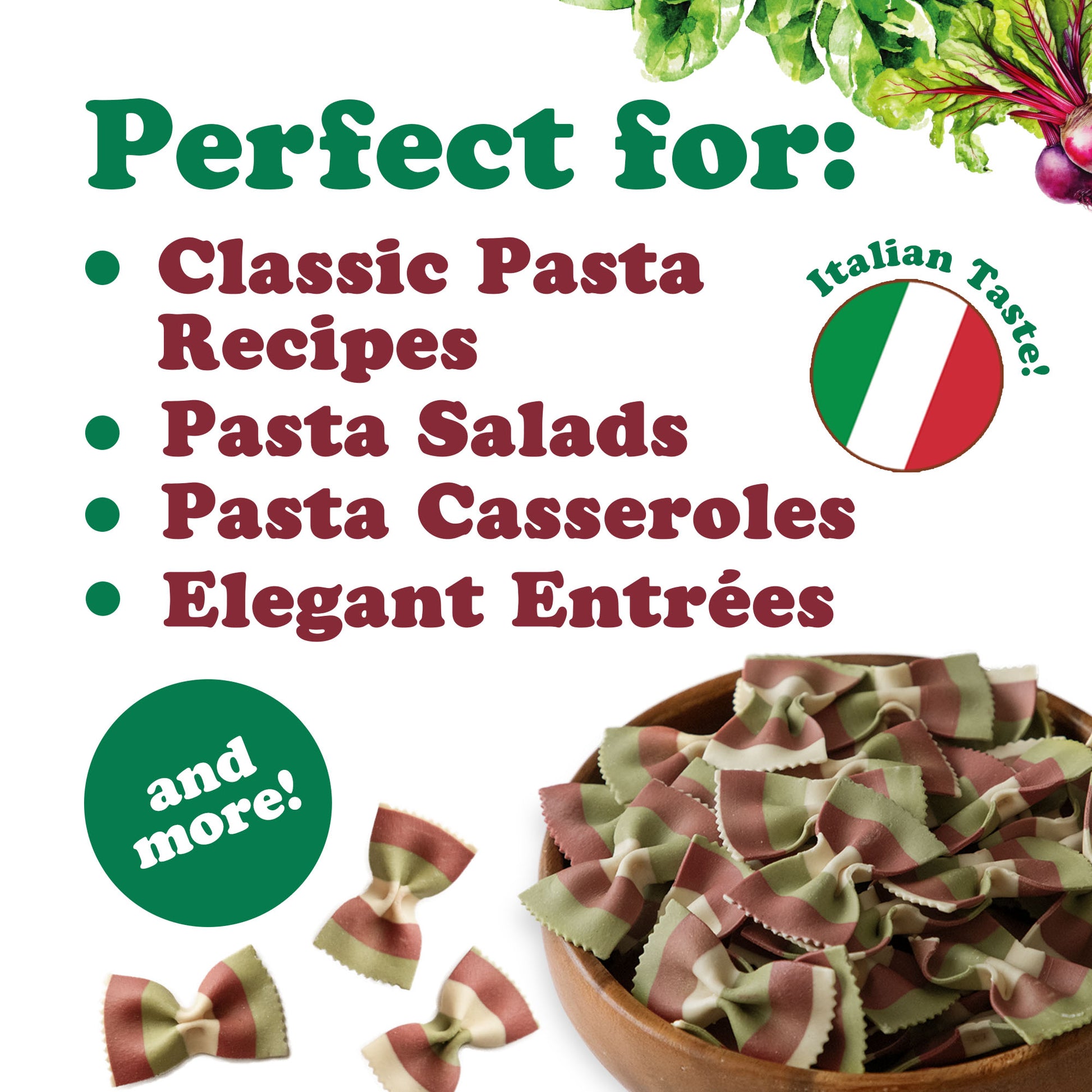 Organic Striped Farfalle Pasta – Italian Artisan Tri-Color Bow-Tie Pasta. Non-GMO, Vegan, Made with Semolina, Beet and Spinach. Perfect for Gourmet Cooking