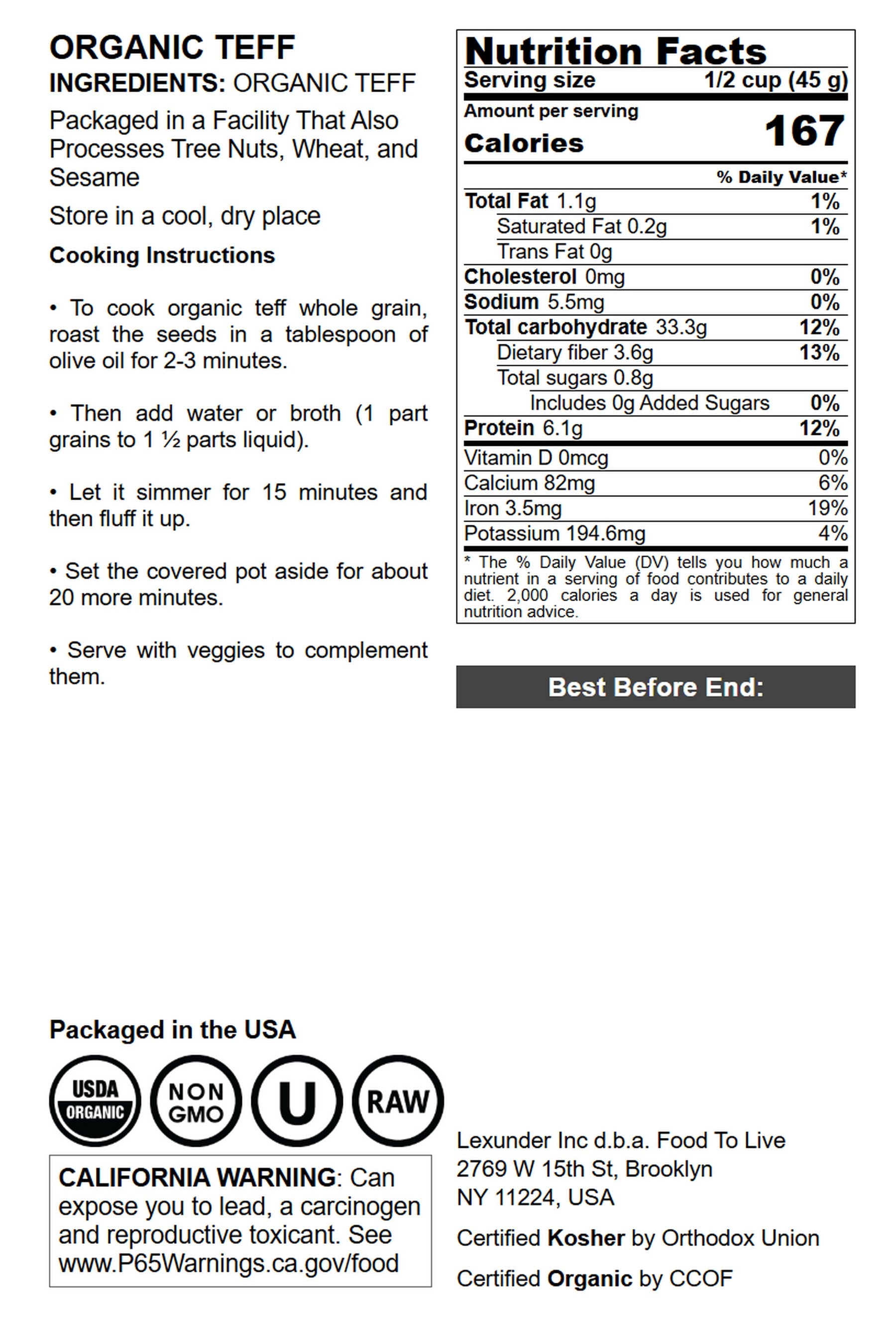 Organic Teff cultivated in India, Australia, and a few other places. Food To Live Organic Teff allows you to enjoy this delicious and exotic whole grain anytime.