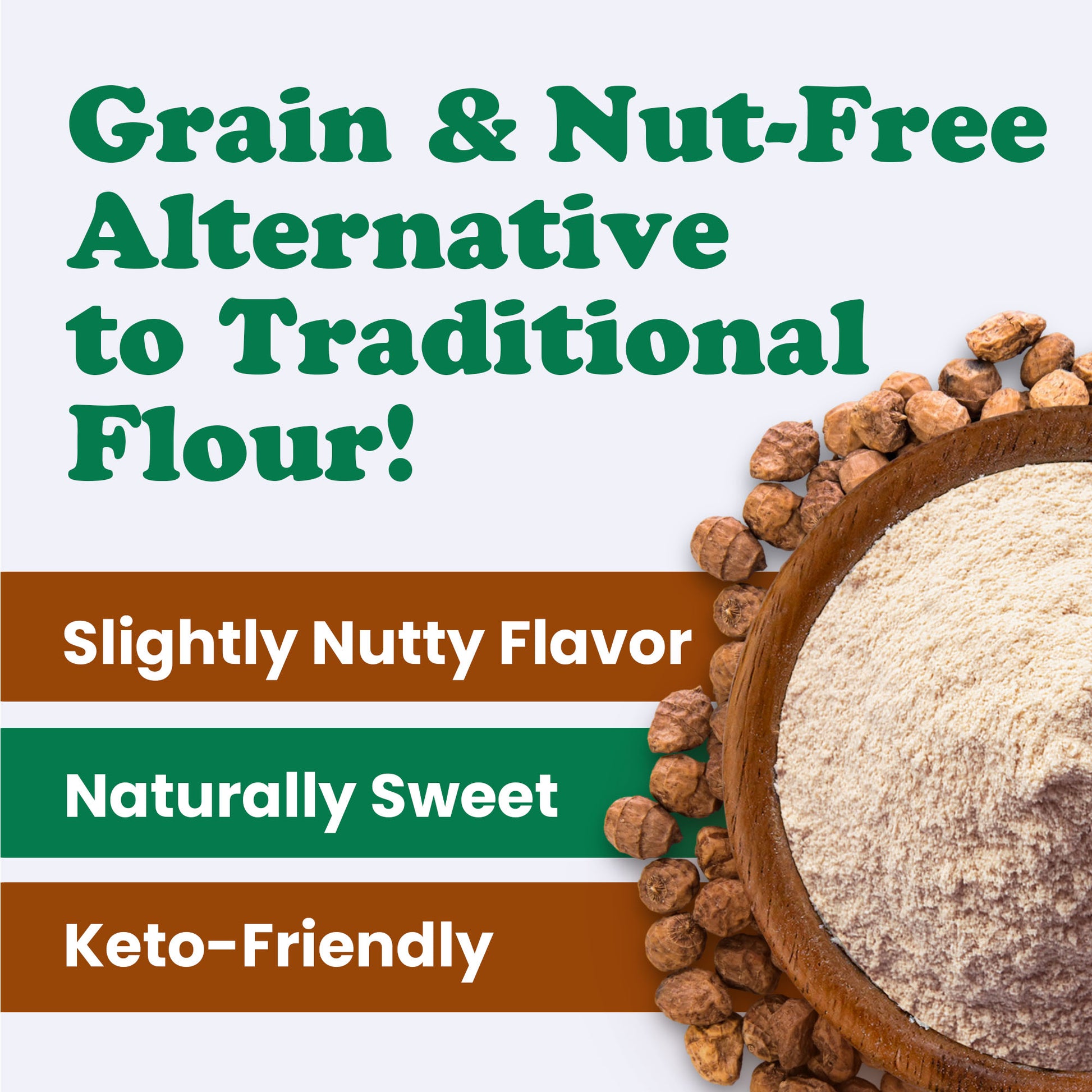 Tigernut flour is naturally rich in dietary fiber and also offers plant-based iron, potassium, and healthy fats. It's a suitable option for those looking for a grain alternative with a balance of complex carbohydrates and micronutrients. The flour's naturally sweet profile makes it a great fit for both sweet and savory recipes without needing to add much sugar.