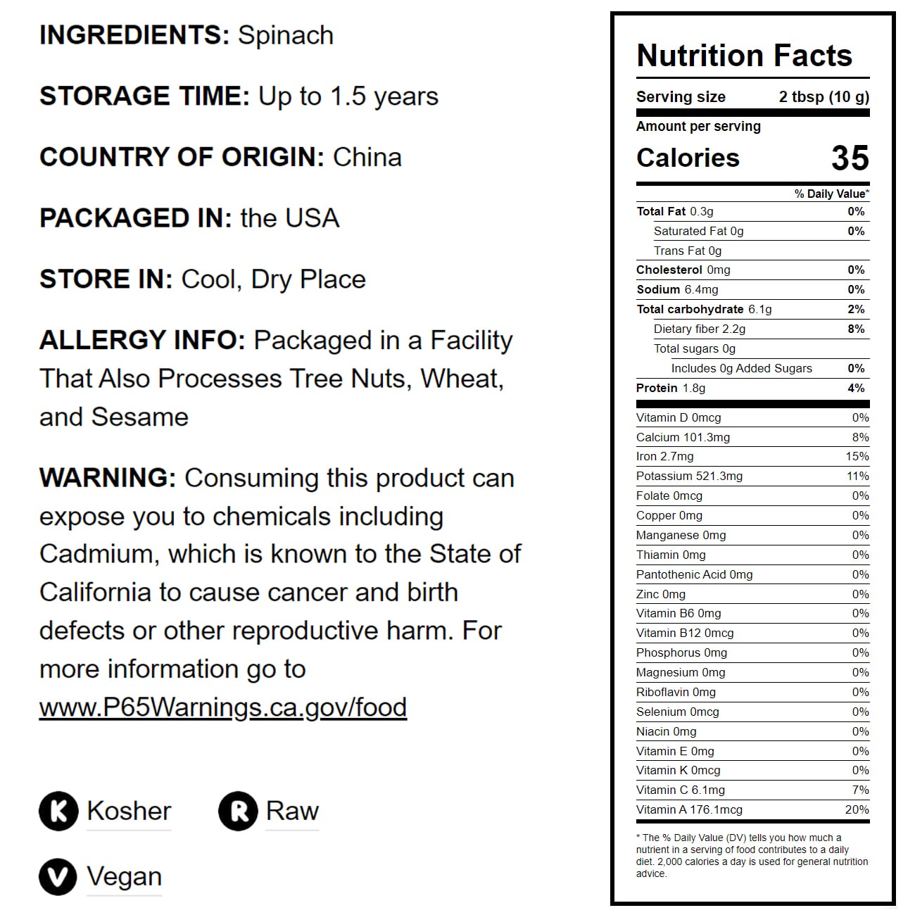 Spinach Powder from Food to Live is a versatile and nutrient-dense superfood that packs a powerful punch of vitamins and minerals into a convenient, shelf-stable form. Made from finely ground, dehydrated mature spinach leaves, this powder offers a milder flavor than fresh spinach while retaining its impressive nutritional profile. Rich in fiber, iron, vitamins A, B, C, and K, it's a simple way to boost the nutritional value of smoothies, baked goods, yogurt, oats, and more. Add a spoonful to your morning berry smoothie for an extra dose of plant-based goodness, or incorporate it into bread and pasta doughs for a nutritious twist. With its pure, vegan, and kosher credentials, this spinach powder is a pantry staple for individuals seeking an easy way to incorporate more greens into their diet. Whether you're looking to fortify your favorite recipes or simply want a convenient way to enjoy the benefits of spinach,Spinach Powder from Food to Live is a versatile and flavorful solution.