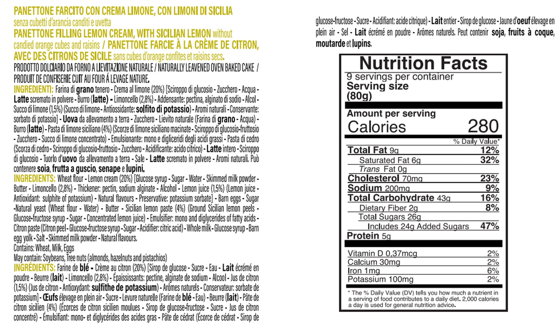Made with high-quality wheat flour, fresh eggs, butter, and natural yeast, this panettone is slow-leavened to achieve its signature airy texture. The creamy lemon filling provides a burst of flavor while contributing small amounts of vitamin C and natural sugars. Though intended as an indulgent treat, the absence of artificial additives and preservatives makes this panettone a cleaner option for sweet holiday enjoyment.