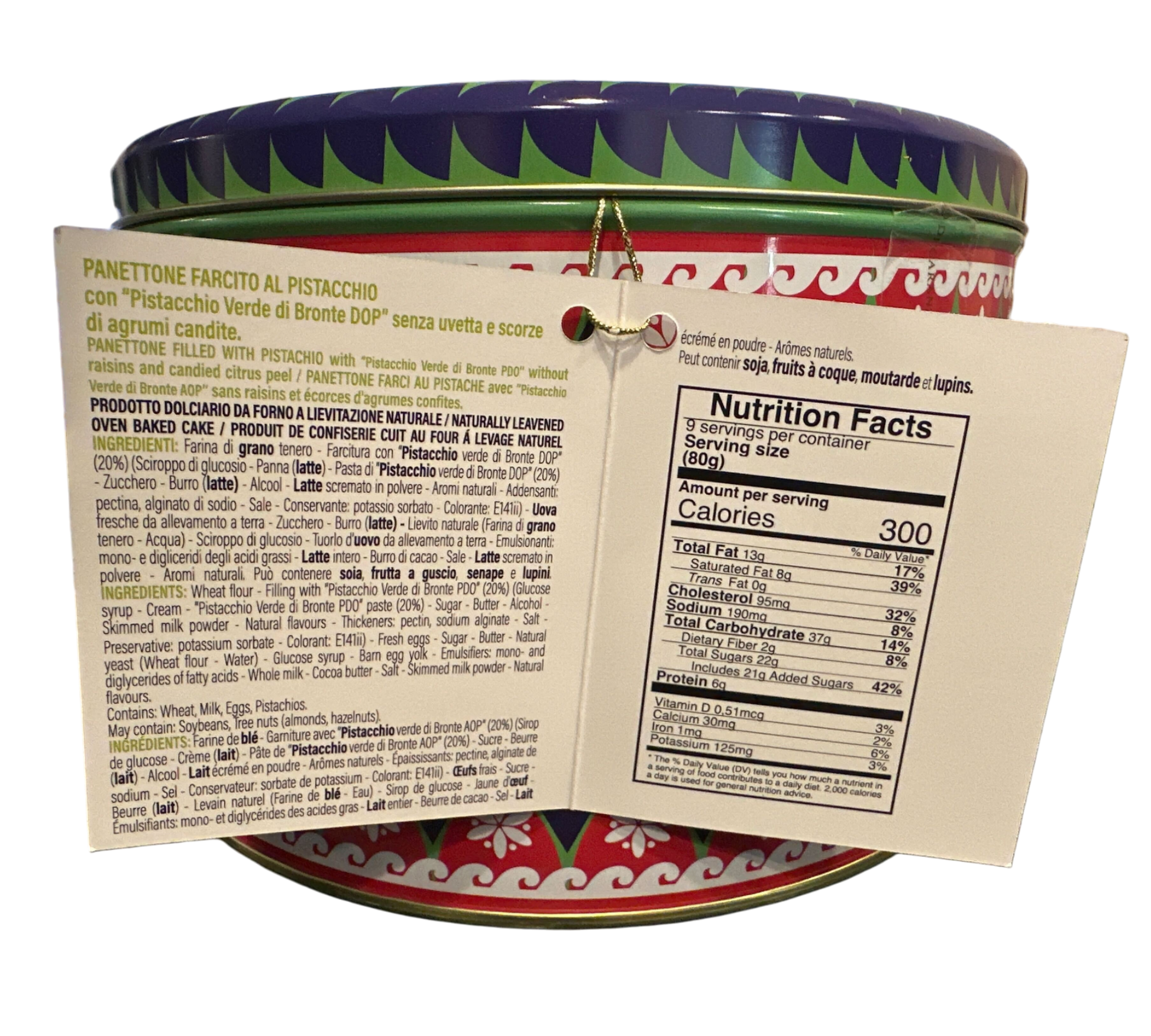 This panettone provides a balanced combination of carbohydrates, proteins, and fats, making it a satisfying treat. The Sicilian pistachios contribute beneficial nutrients such as plant-based proteins, fiber, and essential minerals like potassium and iron. Pistachios are also a natural source of vitamins including vitamin B6, which supports energy metabolism. The cake's wholesome dough contains flour, eggs, and butter, delivering energy and flavor in every slice.