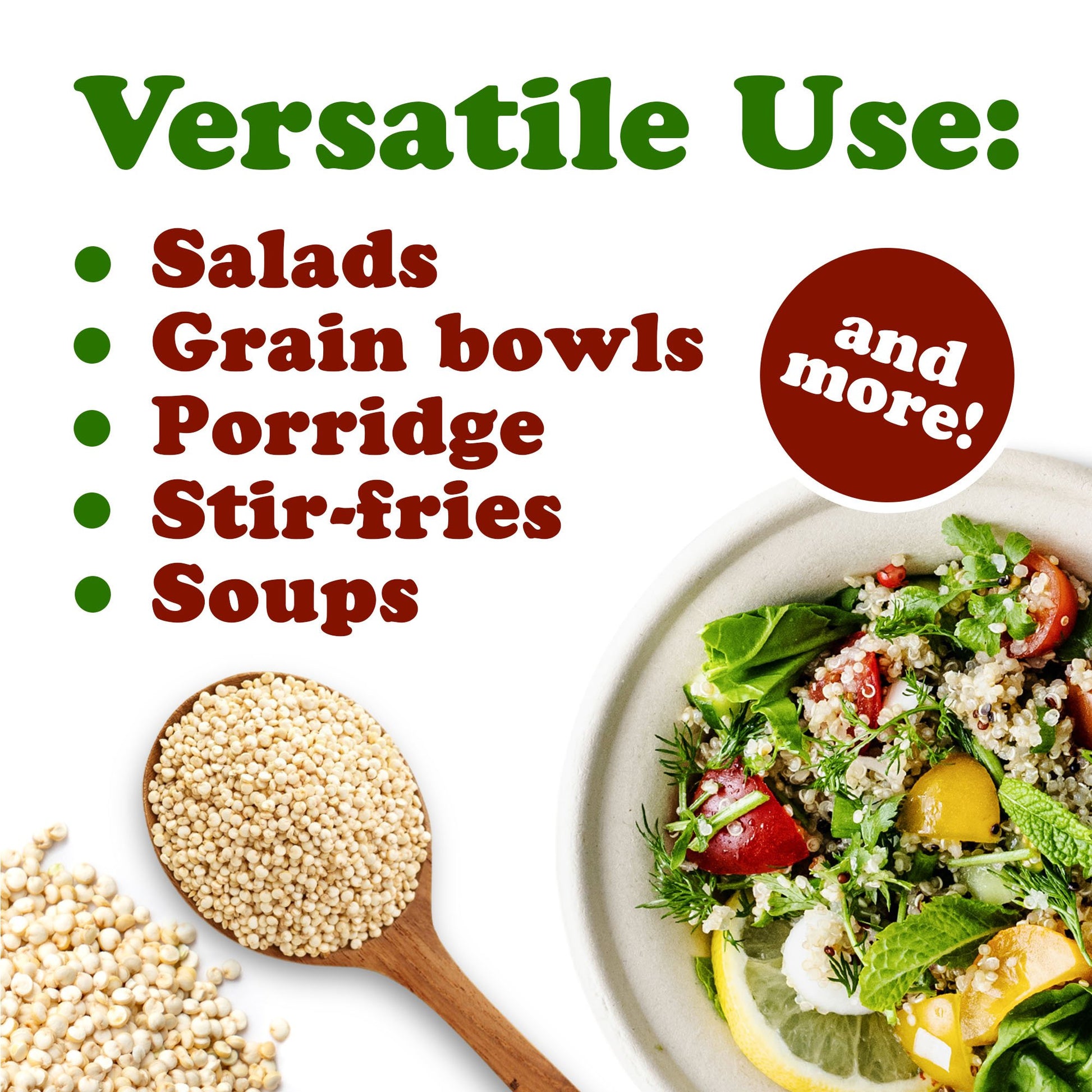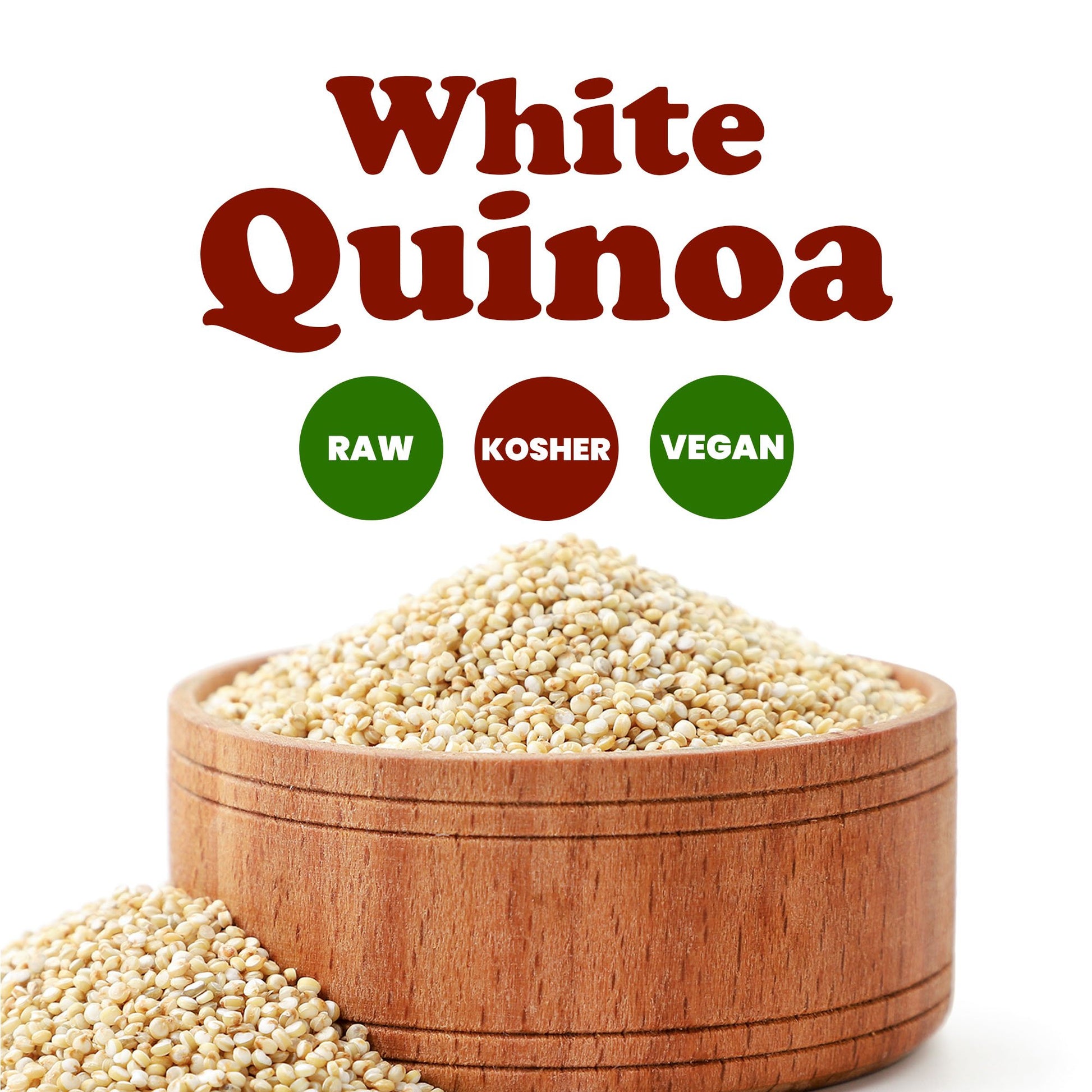 White Quinoa cooks in about 15 minutes and fluffs up beautifully. Use it as a base for salads, grain bowls, and veggie stir-fries, or serve it as a side dish in place of rice or couscous. It's also a great ingredient for veggie burgers, baked goods, or breakfast porridge with fruit and spices. Its neutral taste allows it to absorb flavors from herbs, sauces, and dressings.