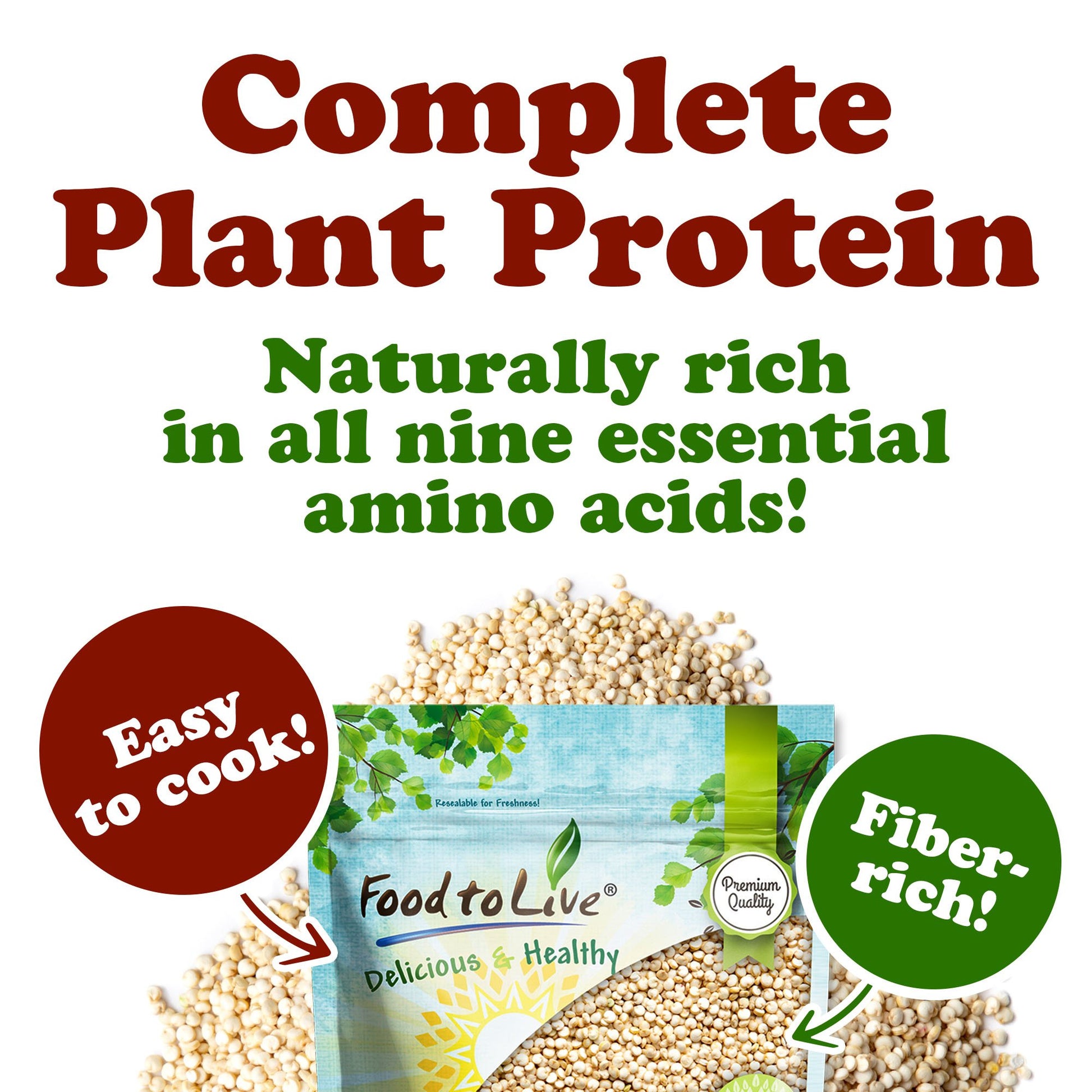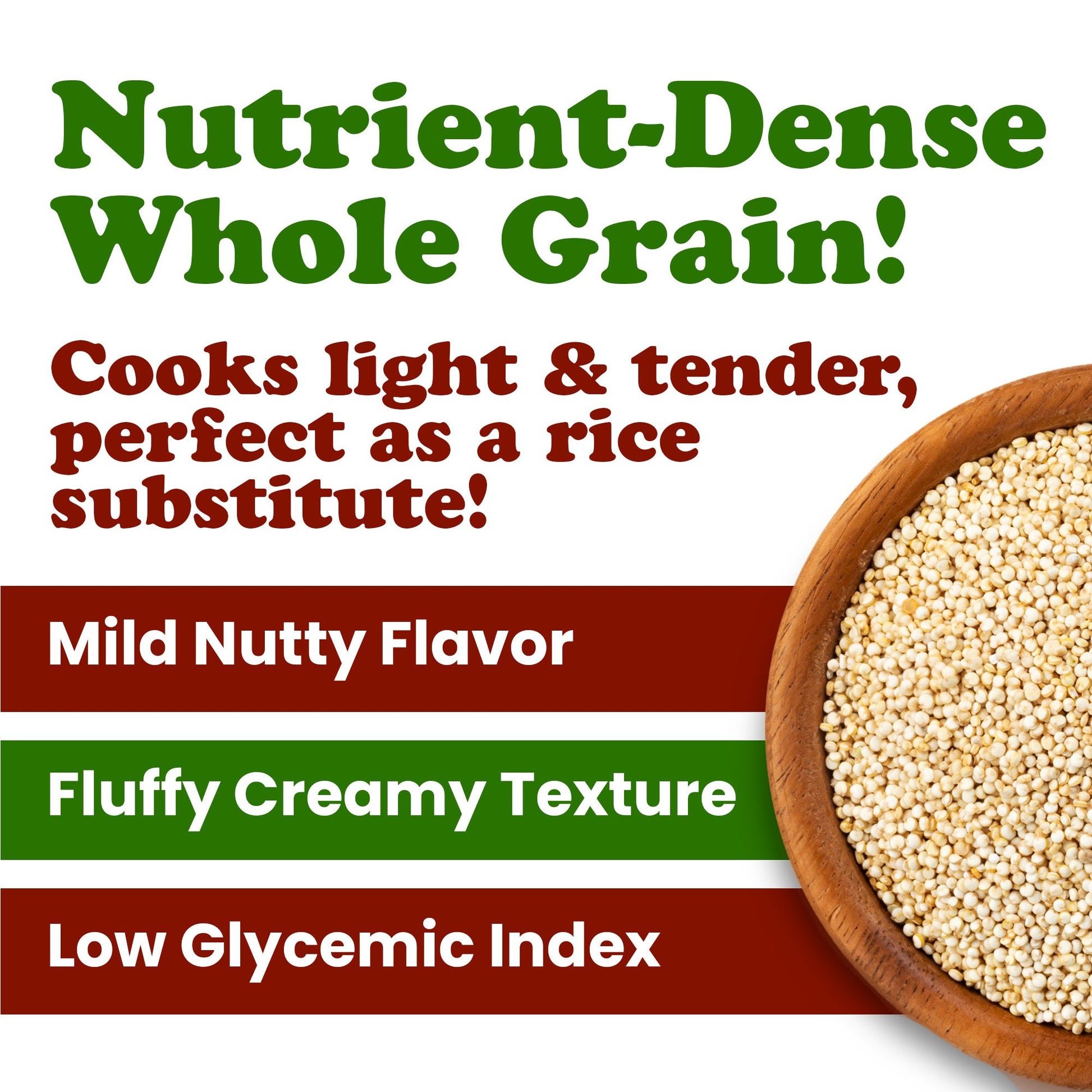 This grain is a complete plant protein, meaning it contains all nine essential amino acids. It's also a great source of fiber, iron, and magnesium. Naturally low in fat and sodium, White Quinoa provides slow-digesting carbohydrates that help fuel an active lifestyle. It's also cholesterol-free and suitable for gluten-free diets.